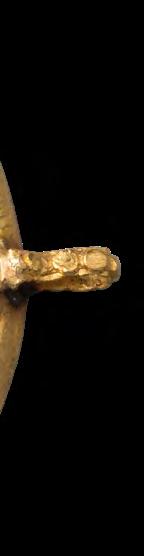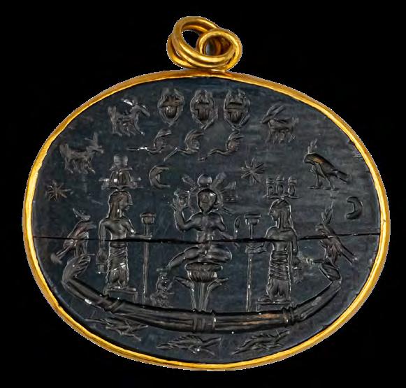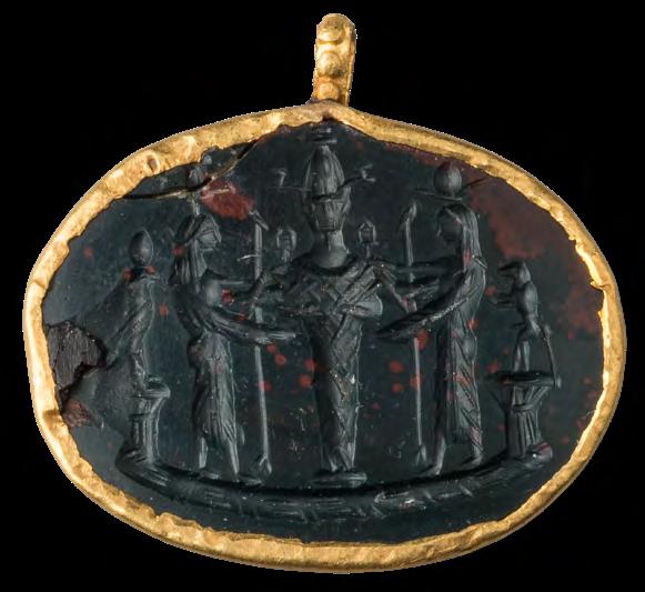 Still in its original gold pendant frame, this amulet depicts the Egyptian deity Osiris mummified and standing between the sister goddesses Isis and Nephthys aboard a papyrus boat. The reverse side shows the god Serapis mummified, along with the Egyptian magical name Bainchoooch, “spirit of darkness.”
