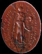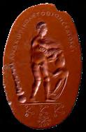 This gem shows Hekate, the Greek goddess of magic, holding two torches. Unusually, she has been given the head of a cow, the sacred animal of the Egyptian deity Hathor, with whom she was sometimes equated. It is undecorated on the reverse side.