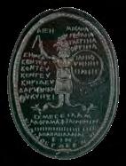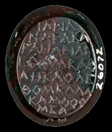 The Ptolemaic Greek rulers of Egypt introduced the deity Serapis into the local pantheon in the 3rd century BCE. Here Serapis sits enthroned within an ouroboros (snake with its tail in its mouth). The inscription includes a magical palindrome and an enigmatic formula of uncertain purpose.