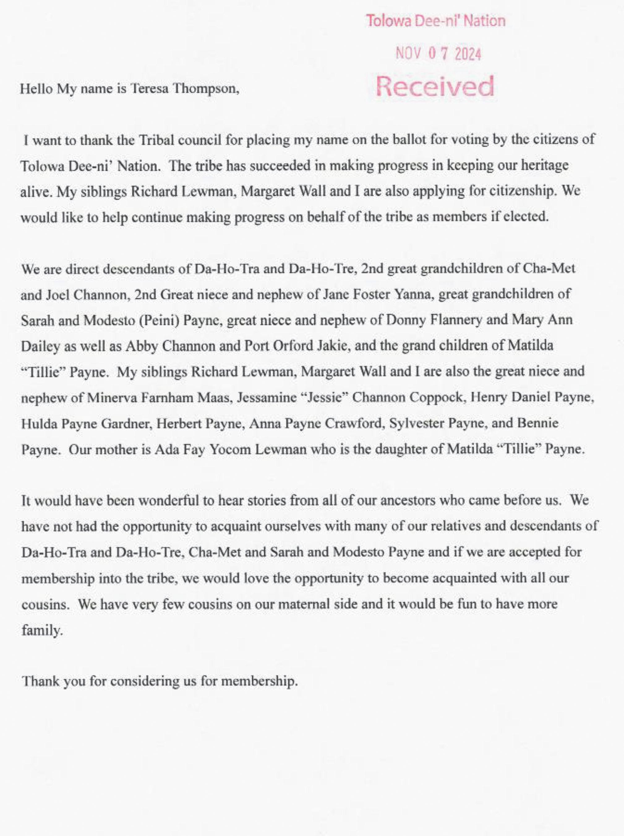 The Tolowa Dee-ni' Nation Tribal Council has approved three candidates for the January 18, 2025, Petitioner's Election: Richard Lewman, Teresa Thompson and Margaret Wall.