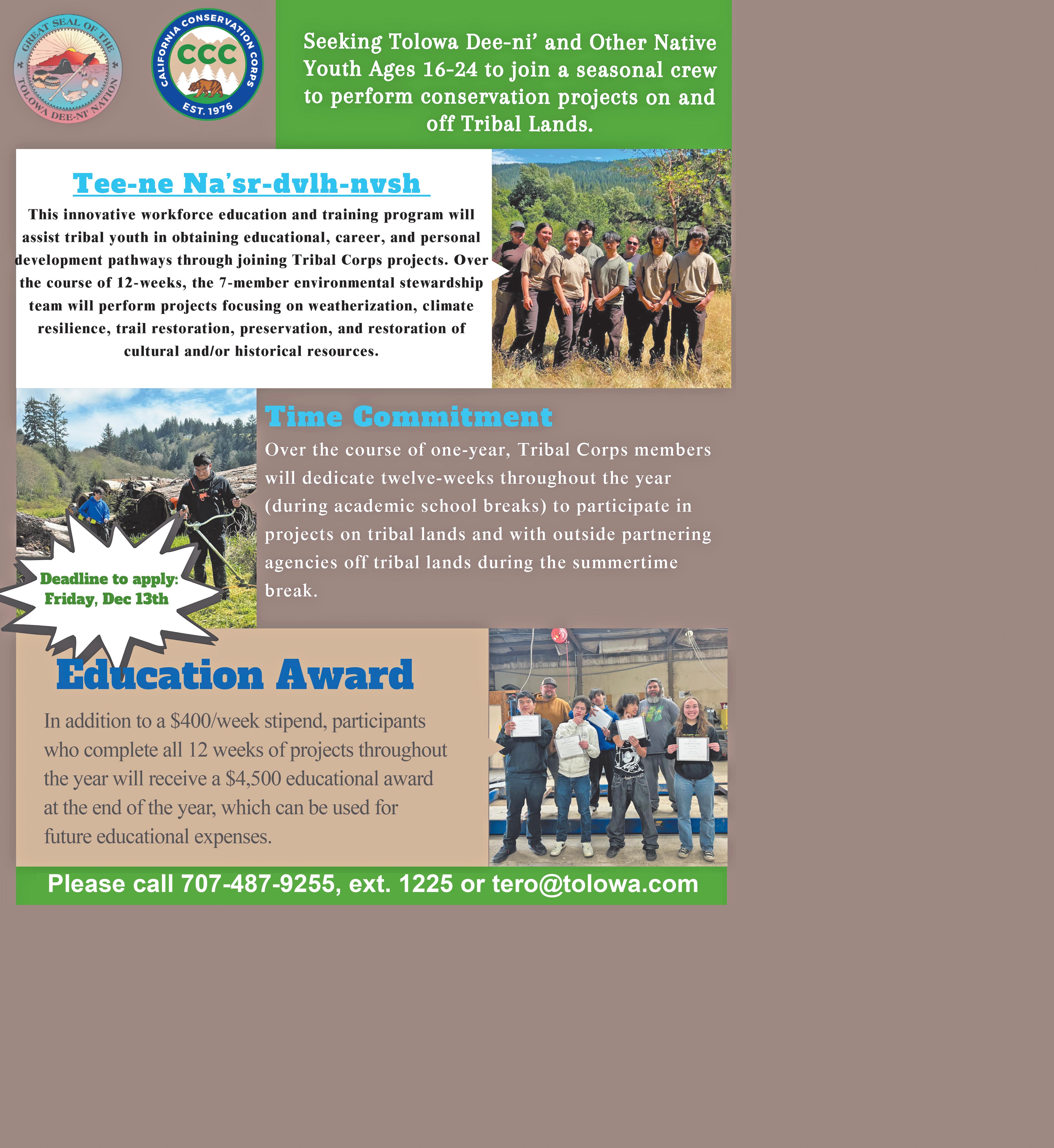 Nee-san-naa-xee-ch'aa-ta Num-nii~-ma~S (December) 2024 Tribal Government Newsletter published by the Dee-ni' Nation, 12801 Mouth of Smith River Road, Smith River CA 95567. Website: www.tolowa-nsn.gov. Articles do not necessarily reflect the opinions of the Tribal Council of the Tolowa Dee-ni' Nation or their Staff. The Tribal Council of the Tolowa Dee-ni' Nation reserves the right to use their discretion in the information they publish. As per the Tribal Council of the Tolowa Dee-ni' Nation, no article shall be published or acknowledged in the tribal newsletter that does not promote and protect the best interests of the Nation. Contact