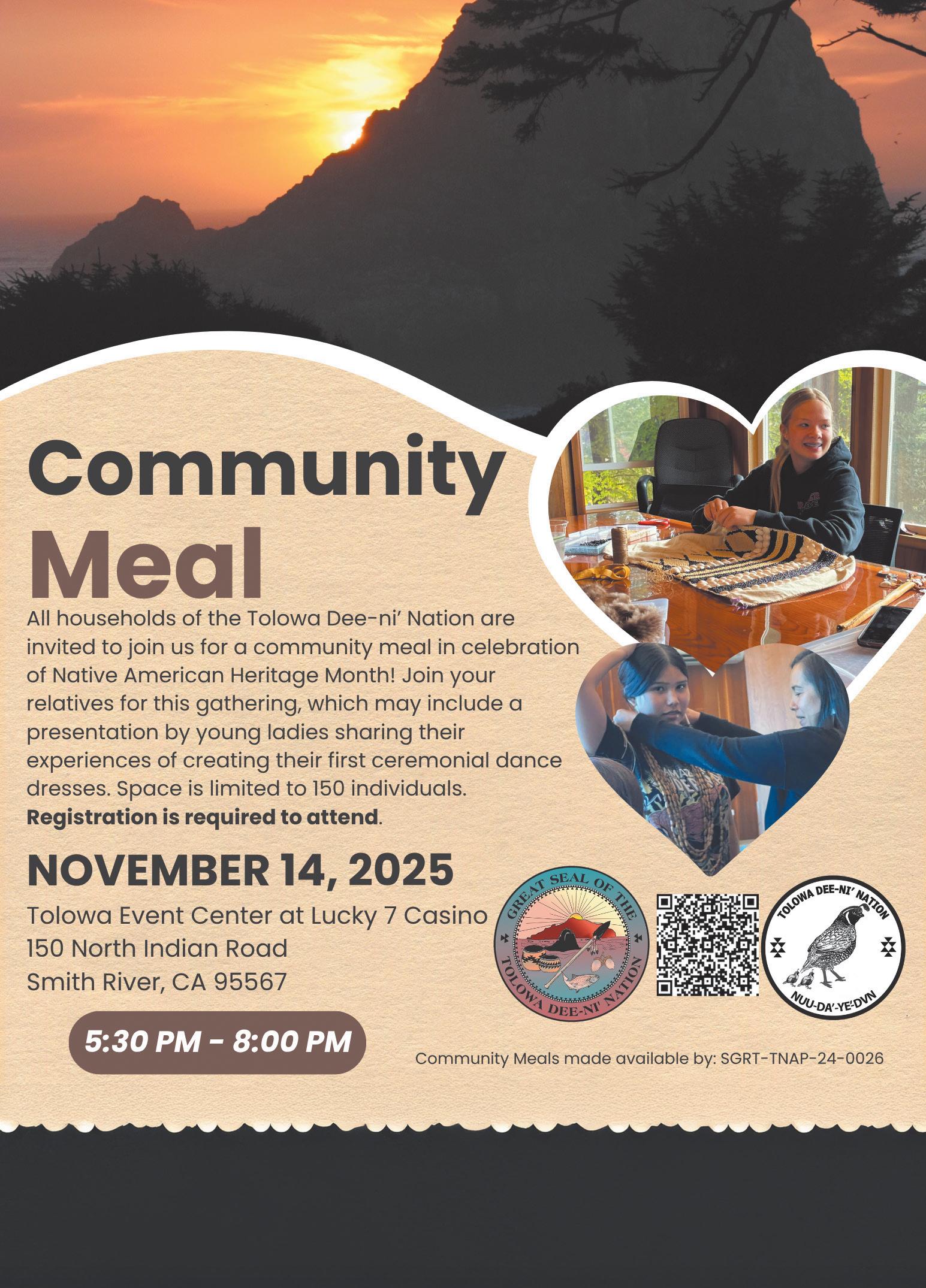 Nee-san-lha'-ch'aa-ta Num-nii~-ma~s (November) 2025 Tribal Government Newsletter published by the Tolowa Dee-ni' Nation, 12801 Mouth of Smith River Road, Smith River CA 95567. Find our website at www.tolowa.gov. Articles do not necessarily reflect the opinions of the Tribal Council of the Tolowa Dee-ni' Nation or their staff. The Tribal Council of the Tolowa Dee-ni' Nation reserves the right to use their discretion in the information they publish. As per the Tribal Council of the Tolowa Dee-ni' Nation, no article shall be published or acknowledged in the tribal newsletter that does not promote and protect the best interests of the Nation. For information, contact Public Information Officer Scott Graves at scott.graves@tolowa.gov, call 707-487-9255.