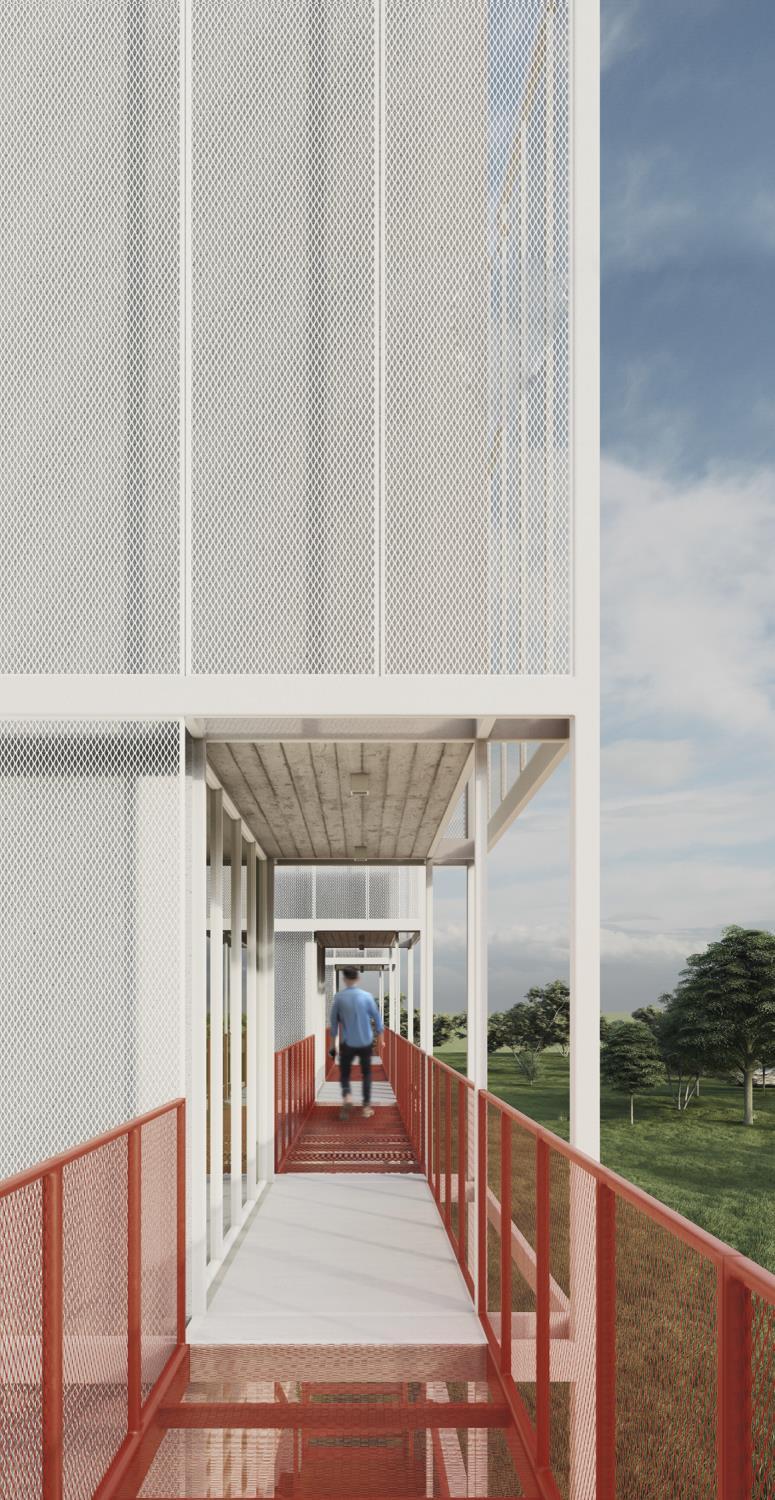 La estrategia de lo intimo se construye en un nivel inferior, potenciando el encuentro entre la comunidad familiar que habita el conjunto habitacional, por otro lado las viviendas como tal se piensa como una atmosfera permeable al contexto y su condición, el diseño aborda privacidad entre los mismos volúmenes habitables. No obstante, plantea una instancia de encuentro materializada en un pasillo con la cualidad de mirador.