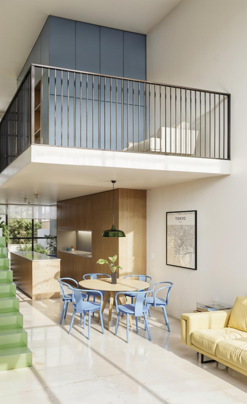 Los espacios de inflección se articulan mediante módulos que ofrecen programas a partir de la necesidad (baños, cocina, almacenamiento), entregando una separación funcional sin perder la continuidad espacial. La idea era lograr un hogar que no solo fuese práctico, sino que también tuviera una personalidad fresca y distintiva.