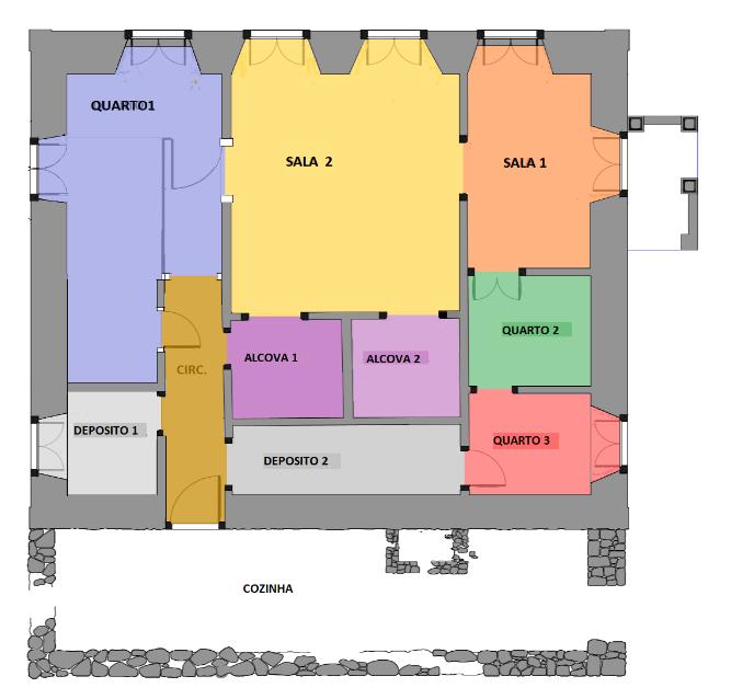 AS RUÍNAS DA COZINHA, na parte posterior da edi fcação, apresentam resquícios de suas paredes em pedra e barro, mesmo sistema e materiais utilizados no restante do sobrado. A cobertura era feita com caibros roliços num prolongamento da água do telhado na face oeste.