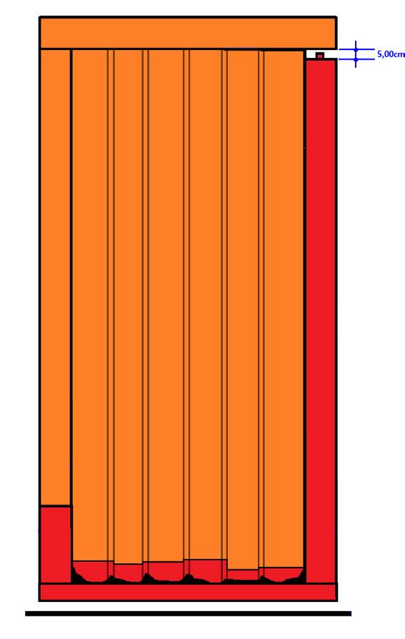 muita possibilidade de infiltrações, tinha um prolongamento que cobria a cozinha, com inclinação diferente, menor, tambem encontramos resquícios de um beiral de aproximadamente 70cm, que existiu a pouco tempo. A vegetação invasora nessa água são epiftas, samambaias que formam uma rede, xaxim em todo o canal, que retem a umidade, criando um ambiente crítico para a telhas e para as madeiras e constantemente úmido o interior. Água Norte (lat. Esq.),