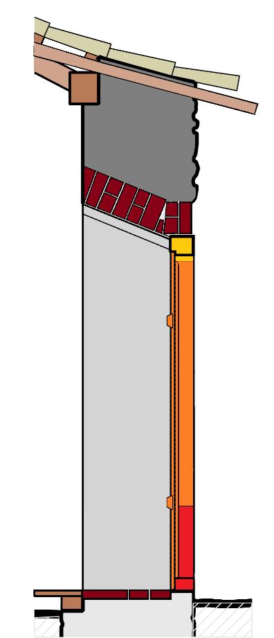 FACHADA SUL: a sequência de imagens na página anterior mostra a evolução das deteriorações. Num primeiro momento, uma argamassa no encontro do portal com a alvenaria e a umidade no rodapé externo, respingo do beiral. Depois, vemos todo o contorno do portal da janela pós intervenção com argamassa incompatível, destacando-se à sua maneira, diferente do restante da face. Vemos o revestimento sobre a verga da porta de entrada e uma parte ao lado do medidor de energia com coloração diferente, por serem intervenções feitas posteriormente, sem pintura. Hoje, a fachada toda está com o revestimento comprometido, com umidade, microorganismos e vegetações, agravadas exponencialmente com a falta de telhas no beiral, onde a vegetação de porte fez com que as telhas se deslocassem e suas raízes interferissem estruturalmente na cimalha, deslocando as amarrações dos tijolos maciços na parte central, onde a maior quantidade de água escorre há algum tempo, inf ltrando-se tranquilamente entre o revestimento e o substrato, no caso alvenaria de pedra e barro, com a umidade o barro seco da argamassa de assentamento se molha e se desestabiliza, é formada uma rede de raízes que separam o reboco do emboço. O reboco quando úmido, pesa e estufa, desplacando-se e deixando o emboço à mostra, que rapidamente tambem é lixiviado.