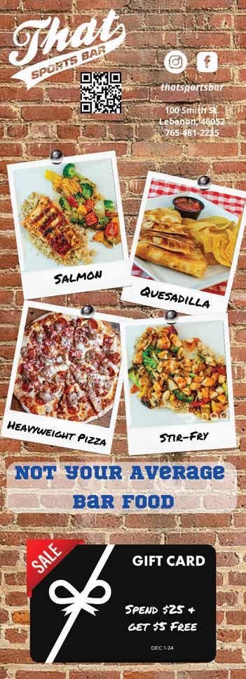 317.922.7588 Cereset® helps your brain relax and reset itself, enabling you to achieve higher levels of well-being and balance throughout your life. •overcome worry & anxiety •restore hope & happiness •release “stuck” stress •enhance learning & memory •support restful sleep •increase energy & performance Samson Leather 119 N MeridiaN St LebaNoN, iN FIELD BREWING A variety pack of 12 unique holiday variations of our award winning Black Friday Stout. 303 East Main Street, Westfield 317-804-9780 / fieldbrewing.com THE 12 STOUTS OF CHRISTMAS TownePost.com / DECEMBER 2022 / BOONE COUNTY MAGAZINE / 35