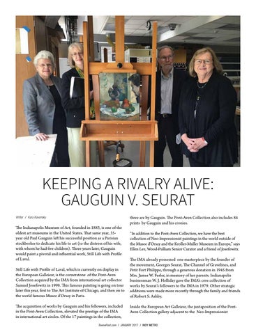 three are by Gauguin. The Pont-Aven Collection also includes 84 prints by Gauguin and his cronies. “In addition to the Pont-Aven Collection, we have the best collection of Neo-Impressionist paintings in the world outside of the Musee d’Orsay and the Kroller-Muller Museum in Europe,” says Ellen Lee, Wood-Pulliam Senior Curator and a friend of Josefowitz. The IMA already possessed one masterpiece by the founder of the movement, Georges Seurat, The Channel of Gravelines, and Petit Fort Philippe, through a generous donation in 1945 from Mrs. James W. Fesler, in memory of her parents. Indianapolis businessman W. J. Holliday gave the IMA’s core collection of works by Seurat’s followers to the IMA in 1979. Other strategic additions were made more recently through the family and friends of Robert S. Ashby. Inside the European Art Galleiesr, the juxtaposition of the PontAven Collection gallery adjacent to the Neo-Impressionist