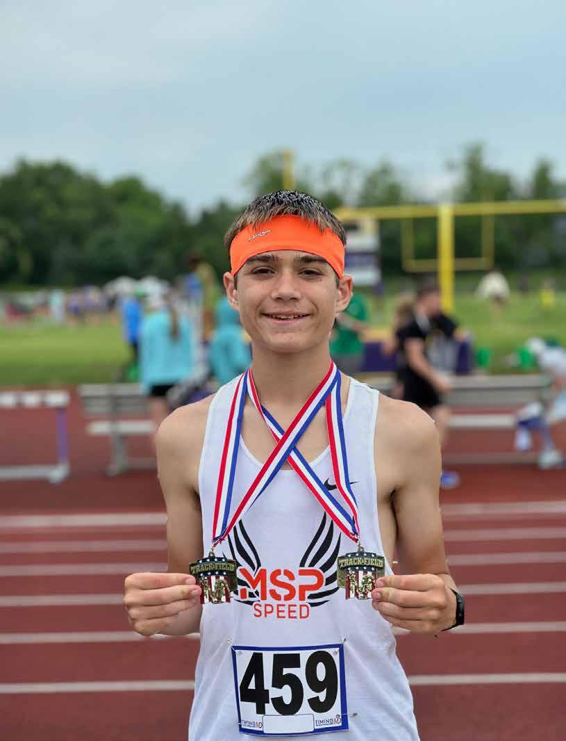 With an invigorated passion for running, Andrew began training regularly during both the on- and off-season, averaging nearly 30 miles per week between November and January. In 2024, Andrew took off competitively, joining the MSP Speed Run Club out of Avon after the school season ended. He finished second in the 1,500 meters and won the 3,000 meters and the 4x800 relay at the USATF Indiana Association Junior Olympic Championship.