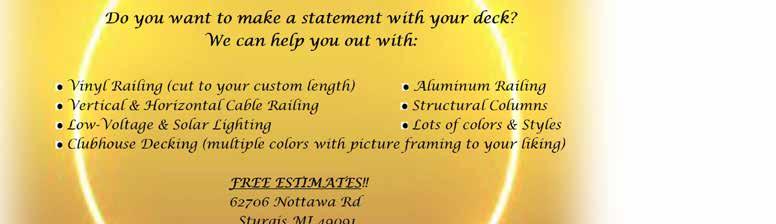For all inquiries contact Sandy Saenz. Open Tue - Fri 9:00am to 5:30pm | Saturday 9:00am to 3:00pm (574)936-5259 | 100 W. Garro St. • Plymouth Frameshoppe@yahoo.com Come check out out our Selection of unique gifts and decor for All Occasions. Choose from Over 1000 different frame options! Let us help you frame your memories... www.simpleestatedgifts.com | Simpleestatedgifts@yahoo.com • Bats • Balls • Gloves • Backpacks • Batting Gloves • Bat Tape • Adidas Outdoors • Brooks Running • UA Cleats & more! 496 E. Lake Street, Topeka, IN (260) 593-3709 Mon-Fri: 8-5pm & Sat: 8-12pm Spring & Summer, We’ve got you covered! • Yard Games • Volleyball • Quad Volleyball • Pickleball • Croquet • Flag Croquet • 6 Player and 8 Player also