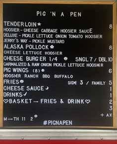 tenderloin sandwich,” Wesson says. “It’s what we were built on and it used to be the only thing on the menu. This is no fritter. This is a hand-cut, twice-cubed, marinated and hand-pounded cutlet of tender, loving care. In order to get full utilization of the pork loin, we also offer boneless ‘pig wings.’ We eventually added the fish sandwich to the menu, made with Alaska pollock, as well as a cheeseburger made with local beef. People rave about our fries as well as our house-made, secret Hoosier sauce.”