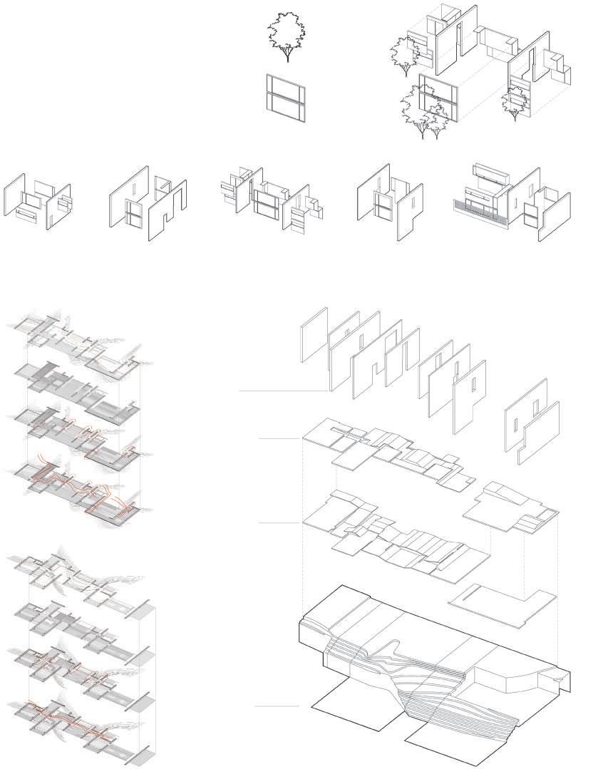 After conducting prior research on Taiwan's night market vendors, it was discovered that there exists a composition between units and modules . Therefore, this element was magnified into architectural practice, composing space through modularization and the relationship with common space . Moreover, the movement of different modes of transportation within the building influences the flow rate of space offering possibilities for varying scales and the formation of indoor streets.