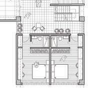 The interior functional spaces are furthermore separated into sleeping and work pods of a sort, additionally delineating functional spaces between them in the larger open living space. The whole becomes a flexible use space, where family members may freely engage in their favorite activities in an open space/hallways.