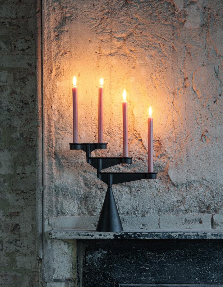 An industrial-strength piece of table-top engineering designed to act as a kinetic centrepiece and produce infinite arrangements. Designed with a series of counterbalanced arms that allow for different positions on all types of table top, SPIN is an exercise in solidity, movement and adaptability. Able to hold tea lights and taper candles with equal elegance, the cast iron contraption takes cues from the heavyweight cantilever mechanisms of dockside cranes and the mechanical elegance of 1950s mobiles. Made in Great Britain, SPIN’s heavy cast iron structure is powder coated black. Engineered to operate with restrained motion, the system allows for measured mobility and an ever changing instantly recognizable silhouette.