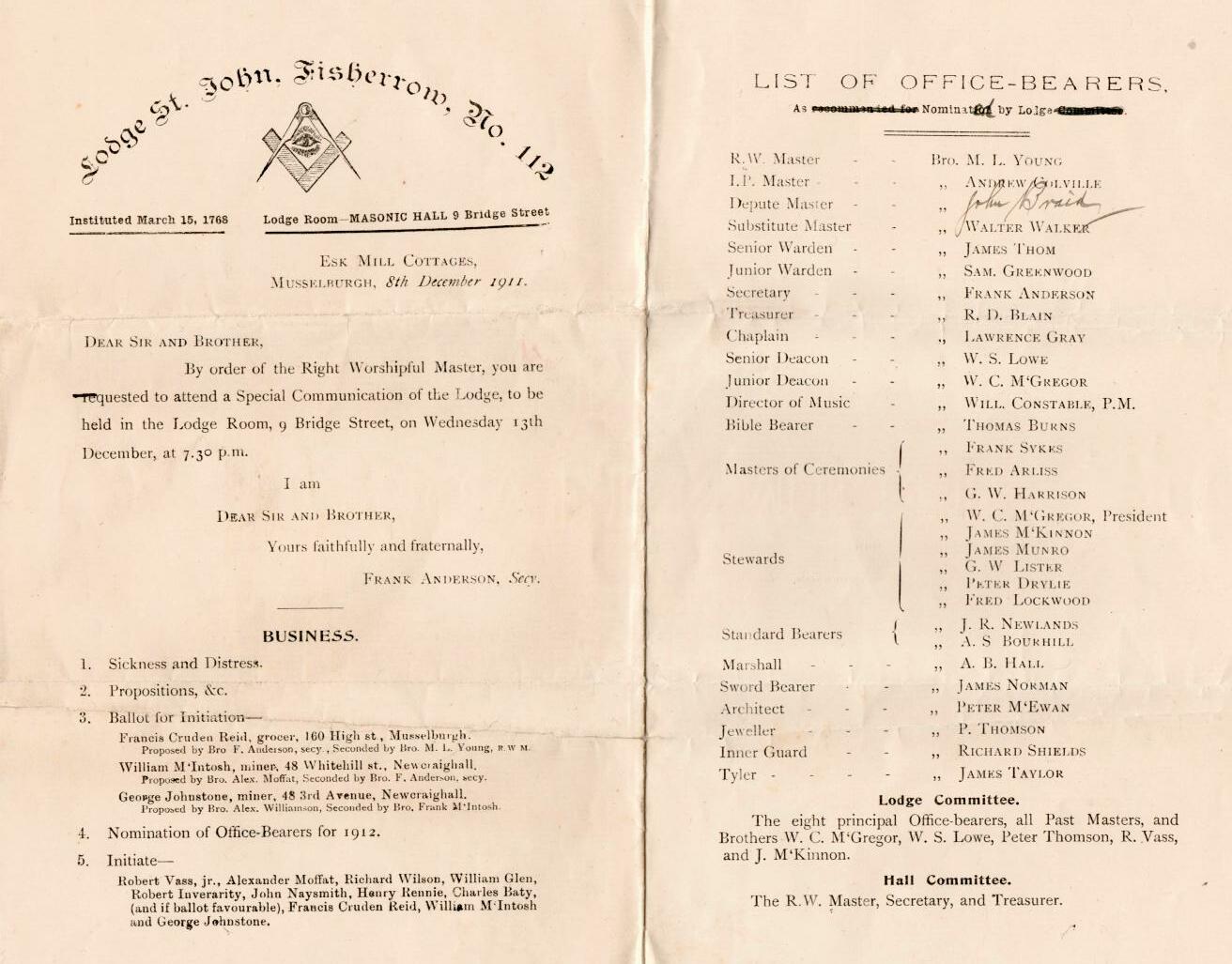 Bro. Thom R.W.M. extended congratulations on behalf of the Lodge to Bro. William constable on his elevation to the Honourable position of Provost of the Burgh of Musselburgh.