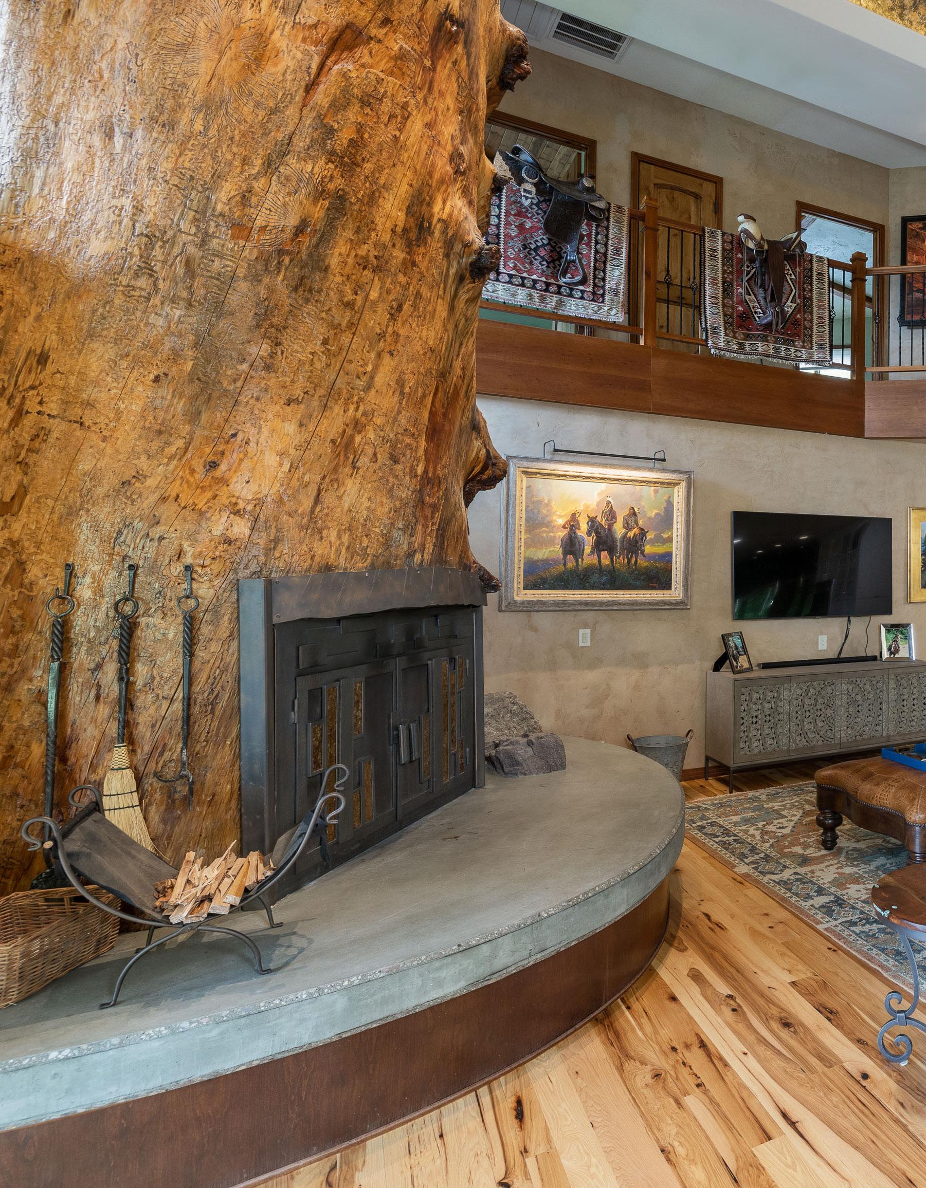 Featuring 6,464 sf, 4 bedrooms and 5 bathrooms, the home offers an open floor plan with large view windows, taking full advantage of the exquisite Snake River Canyon views. A custom fireplace showcases an exceptional 100-year old fallen Redwood tree that serves as a dramatic focal point inside the home. The remarkable tree is the inspiration for the beautiful ceiling that crowns the living space. With unique faux painting accents in silver and gold, the ceiling provides a glow and ambiance reminiscent of a star-lit sky.