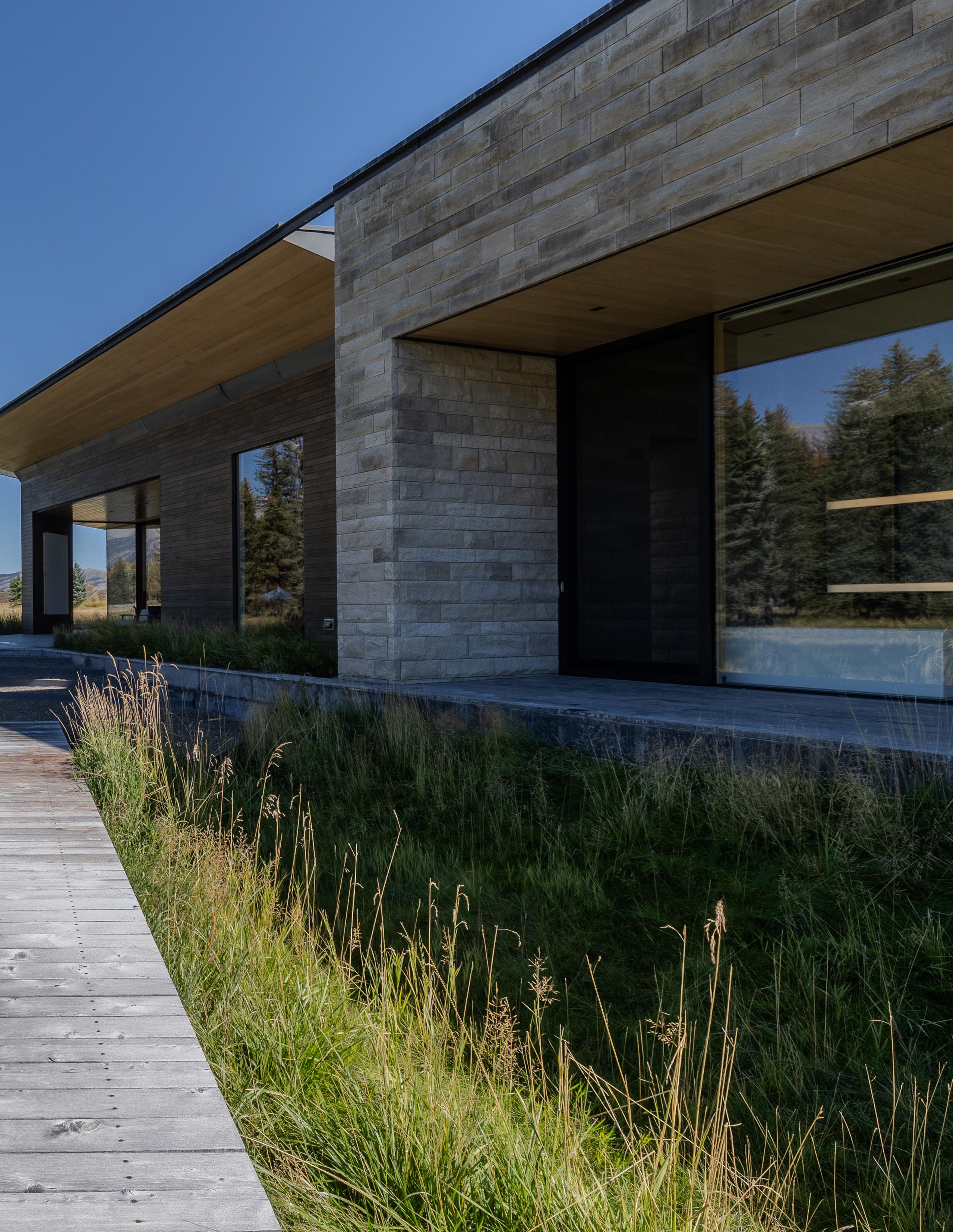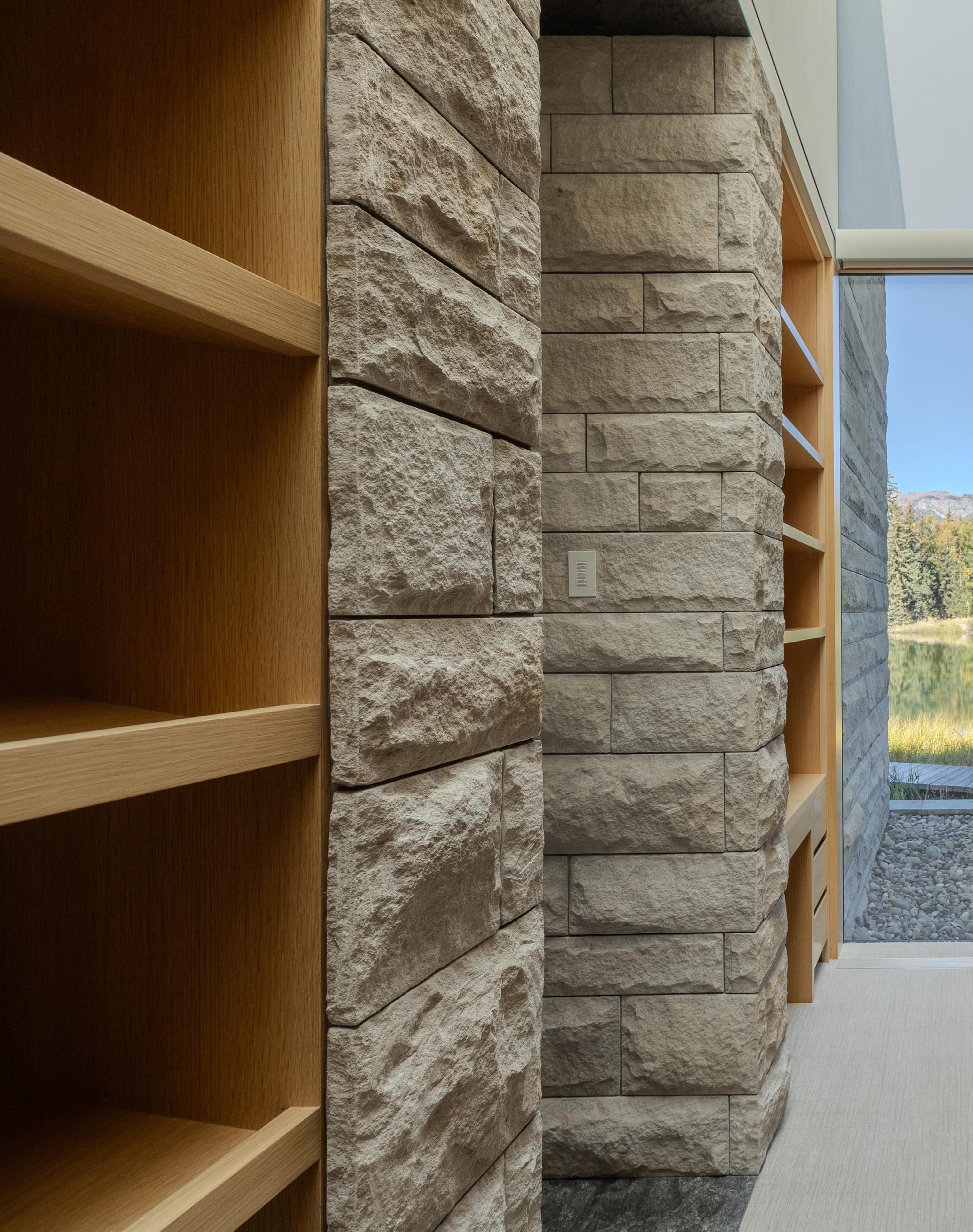 Designed by Carney Logan Burke Architects, and built by Peak Builders, this custom home is in a class of its own. A showcase of state-ofthe art finishes, fixtures and systems, the home’s value lies not just in its beautiful location, views and live water, but within the home’s walls and construction. Exceptional construction and engineering are behind the remarkable walls of glass. Case optical glass from Germany and Poland is of the highest quality glass found in windows. Additionally, these oversized glass windows and doors open to the magnificent landscapes outside. Heated and cooled by a geothermal system, the residence complements its surroundings with its low profile, stone walls and minimalistic design. Featuring 7,587 square feet, the 2 bedroom, 5 bathroom residence separates the back of house functions from the formal living areas, making it well suited to an owner accustomed to a live-in chef and/ or housekeeper. The large metal swivel door makes a statement of simplicity and grandeur as you welcome guests into the home. The foyer features coat closets and a powder room, discreetly tucked out of sight.