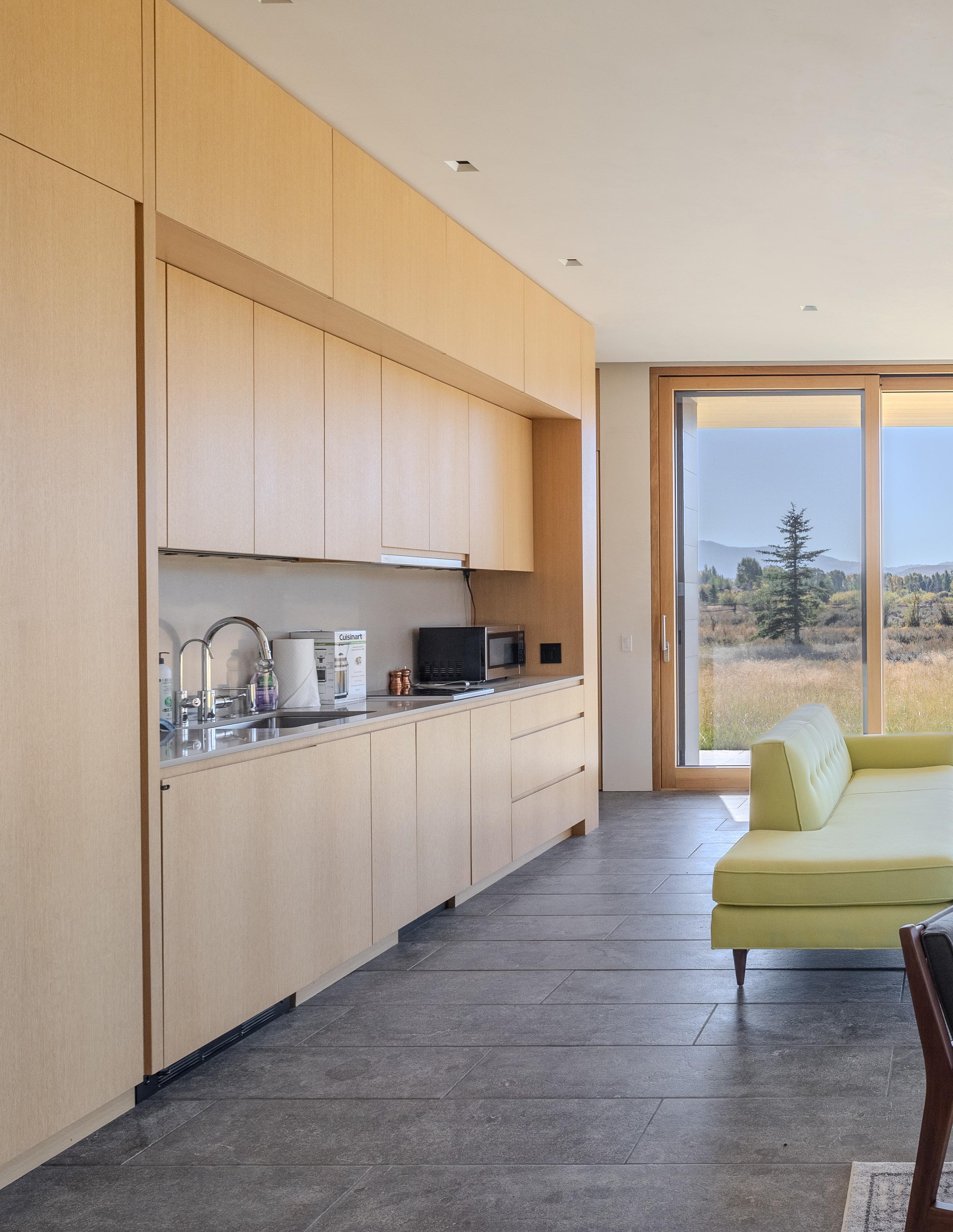 A separate 830 square foot, 1 bedroom, 1 bathroom guest house provides comfortable accommodations for family or guests. With metal and cedar exterior siding, the guest house showcases similar finishes and fixtures as the main home. A kitchenette and gas fireplace provide function and ambiance.