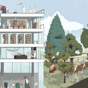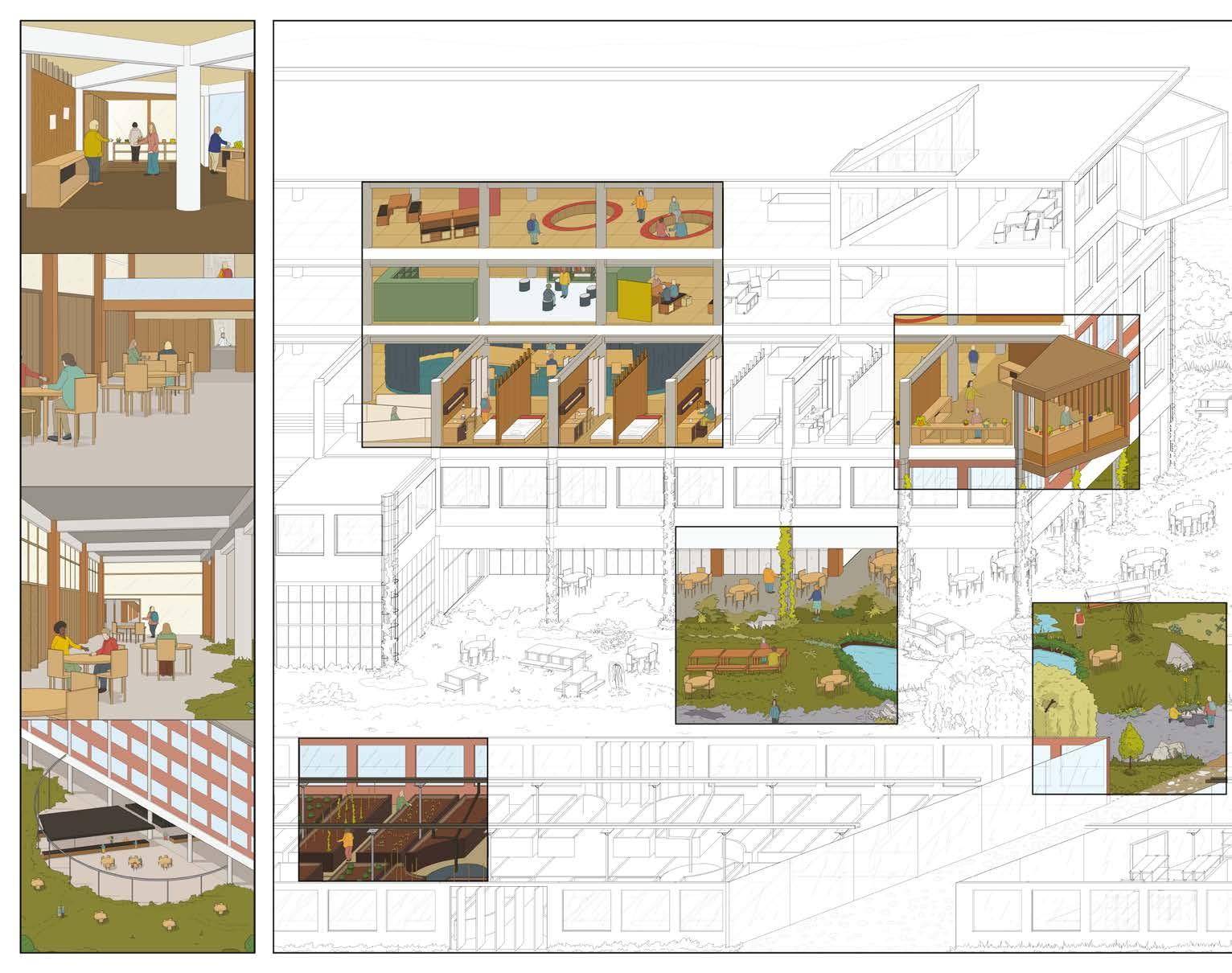 Upper floors facilitate collaborative living, providing collaborative areas to study, and exchange information. For example, “conversation pits” refer to the social interactions surrounding a firepit, the “personal greenhouse” that encourages the care and cultivation of personal plants.