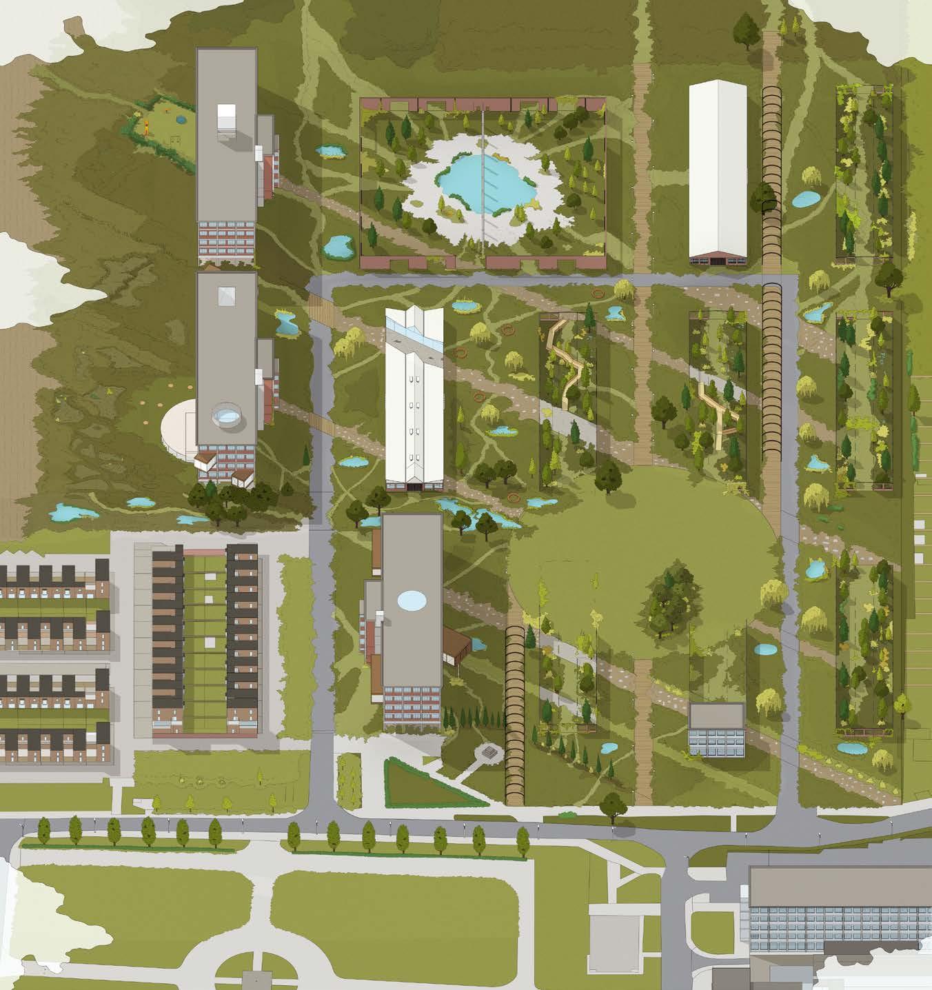 The site’s phytoremediation strategies to remediate the soil and re-wild the site, opening up the possibility of future reuse depending on the community’s needs. The Campus is ideal for teaching sustainability and creating a community separate from the city’s corruption.