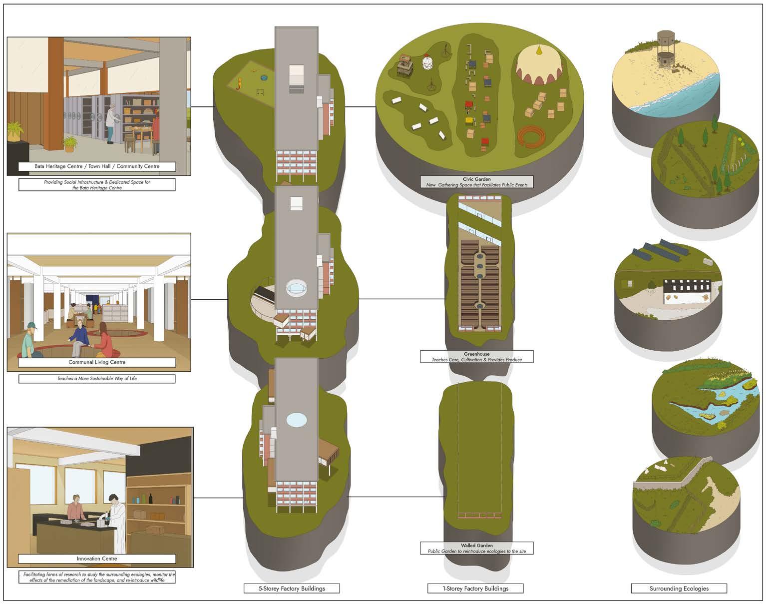 “Factories in a Garden” proposes the reuse of the Bata Factory in East Tilbury, under heritage protection, as the symbol of the celebration of the mono-industry & monoculture.