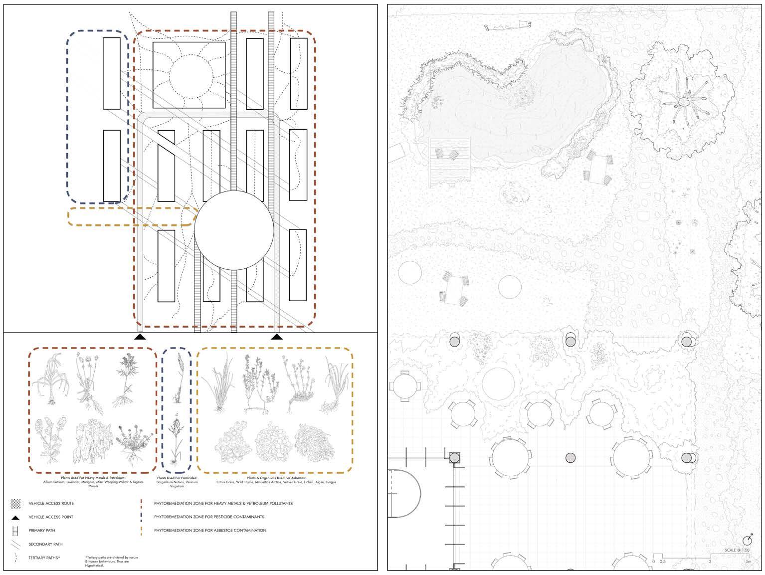 The landscaping incorporates Phytoremediation as a pedagogical tool, using different plants to remediate soil based on contaminants.