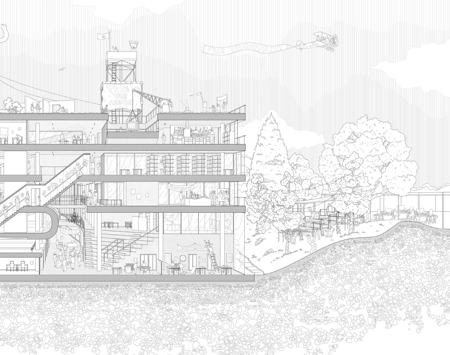 The occupants will develop and monitor the landscape, studying its effects on local wildlife. The site’s natural civic square improves social infrastructure and encourages community networks, creating a new identity while re-engaging with the past.