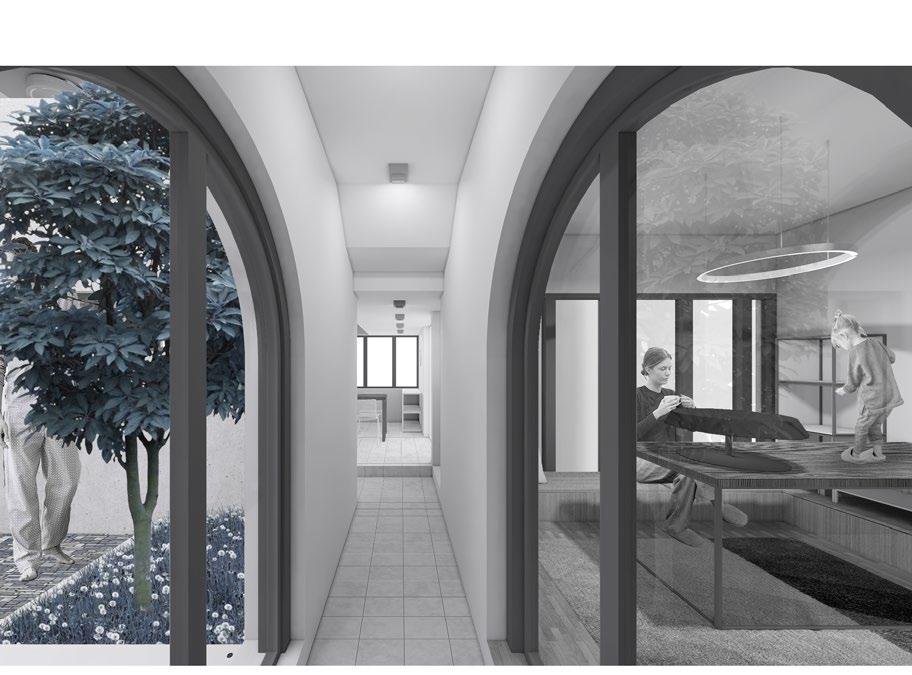 In the project, buildings surround a common farmland for husbandry/ agriculture, which is autonomous by the residents themselves and as a part of the farmland network that improve the productivity in the whole village. The central farmland view is also penetrating into each of the building and create a dynamic collective community. Buildings are also surrounded by other public farmlands, which will turn into public square or park in the next phase according to the chessboard model