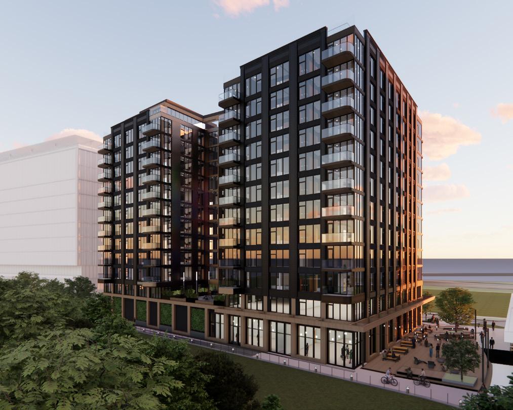 12-story, 330,000 SF mixed-use market-rate mass timber housing development, including 370 apartments, branded ground-level retail and restaurant space, and a rooftop pool and amenity terrace overlooking Anacostia Park and DC's most important monuments. The project is also seeking LEED Platinum and Net Zero Carbon ratings. The façade features masonry piers and exposed timber elements which evoke a modernindustrial feel.