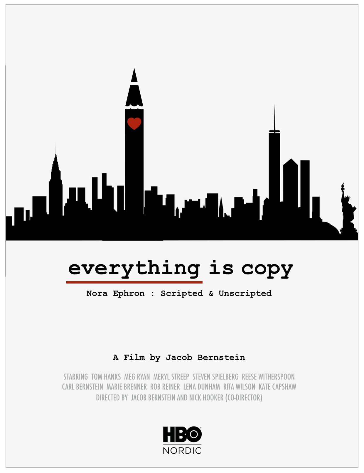 Men, det er ikke tilfeldig hva jeg designer. Jeg konsentrerer innsatsen omkring bøker, filmer, serier osv. som jeg liker veldig godt. Og som jeg anbefaler andre å sjekke ut. Det er mer inspirerende. Som for eksempel filmen Everything is copy. Det er en meget severdig dokumentar om den prisbelønnede manusforfatteren og regissøren, Nora Ephron (1941–2012). Hun både skrev manuset til og regisserte filmene You’ve got mail og Sleepless in Manhatten, og det er, som du kan se, min inspirasjon for denne plakaten. Noras mest berømte manus er nok likevel det til 80-tallsklassikeren When Harry met Sally.