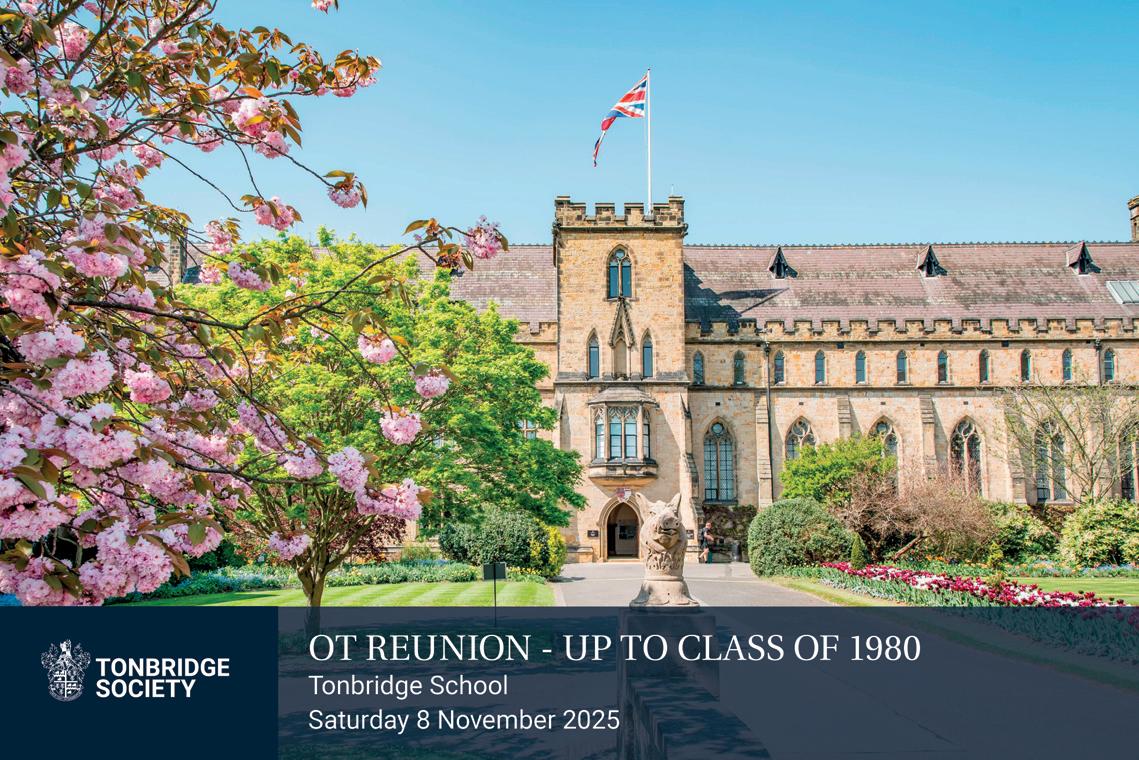 There are the usual pages of past and future events, News of OTs of all generations around the world, and a focus on Giving Day and the philanthropy which has helped Tonbridge since its foundation, and continues to be needed in these more politically unpredictable times. My thanks to all those who contribute to this OT Magazine 2025: and especially to Tara Biddle, our hard-working Alumni Relations Manager; to Ian Bradley, our new President; and to all those who sustain and support our School and Old Tonbridgian Society.