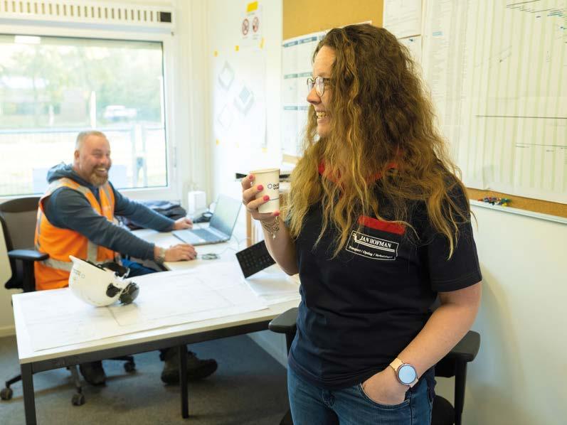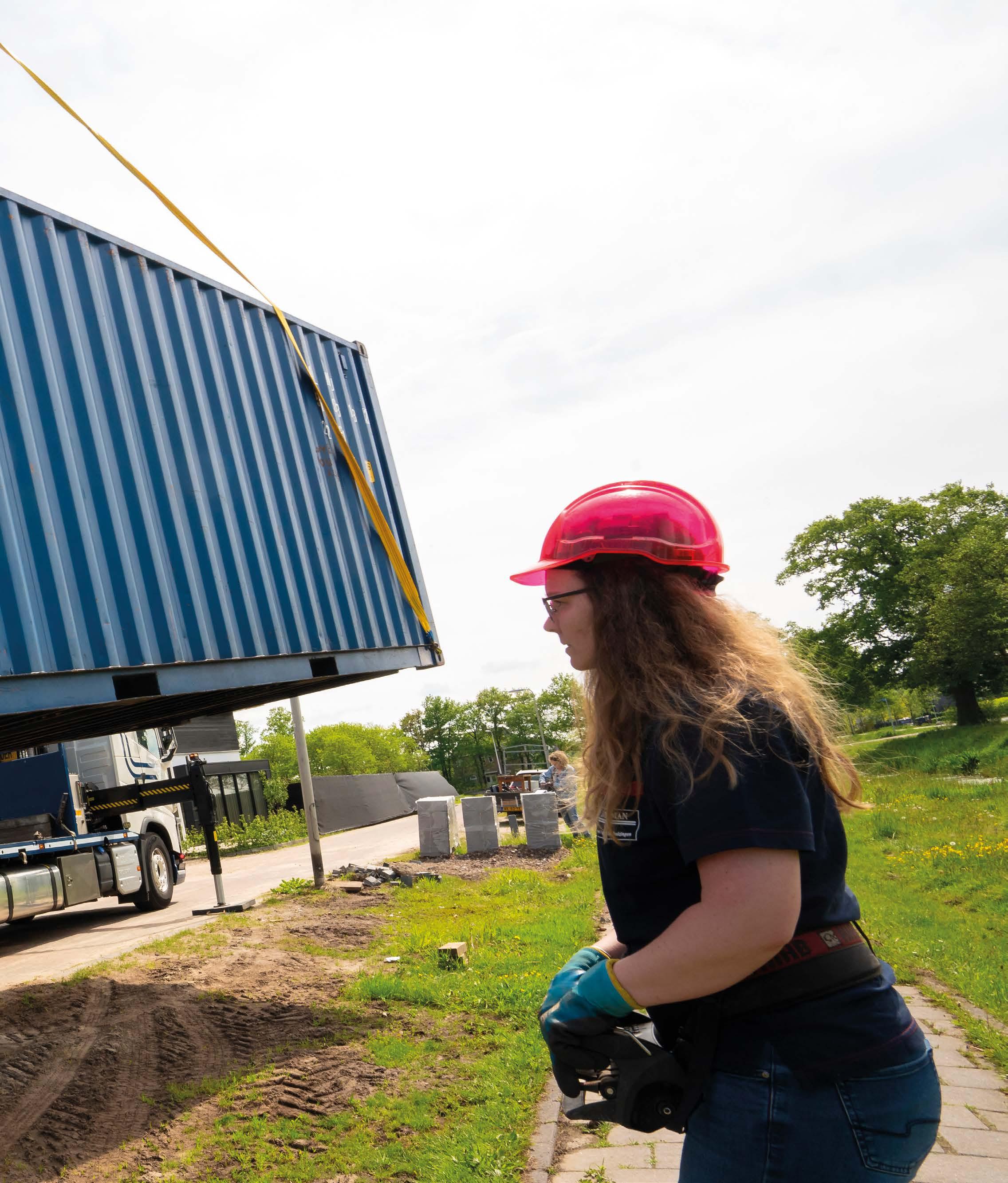 Geconcentreerd kijkt Nathaly naar de schommelende container in de lucht en de lege plaats tussen de bouwkeet en een container waar ze het gevaarte moet neerzetten. Behoedzaam laat ze de container zakken tot hij bijna de grond raakt. Op de houten balken die al klaarliggen, worden nog snel even een paar latjes neergelegd en dan staat de container. Nathaly laat de kraan zakken om de hijsbanden los te maken. Ze laat de autolaadkraan over de twee bouwketen zwieren om daar een bok met steigermateriaal op te takelen en in een aanhanger te leggen. Voor Nathaly is dit een klusje waar ze haar hand niet voor omdraait.