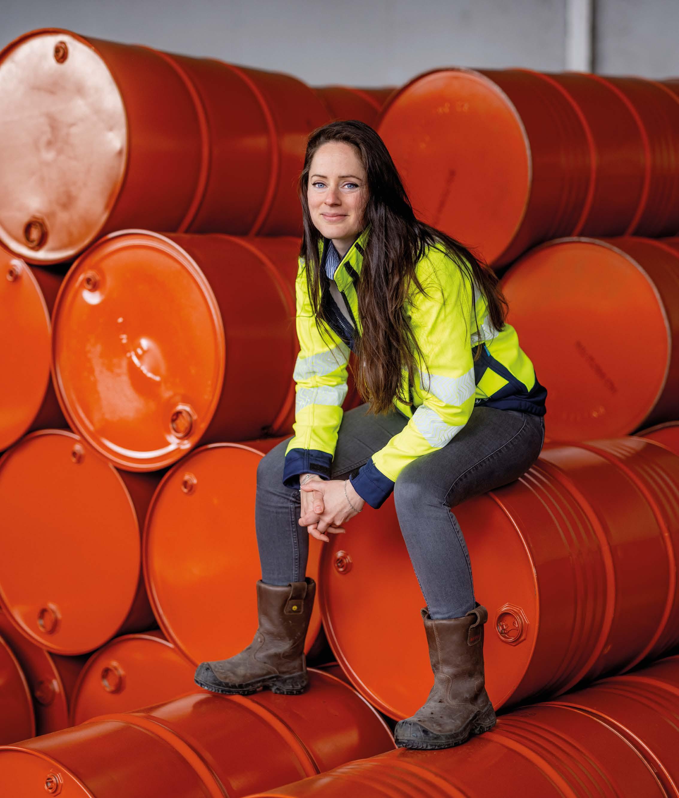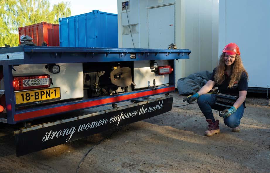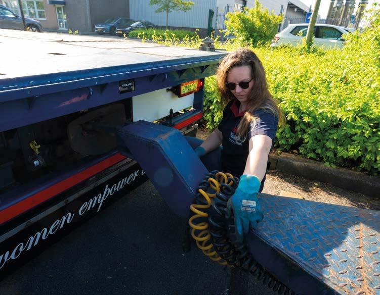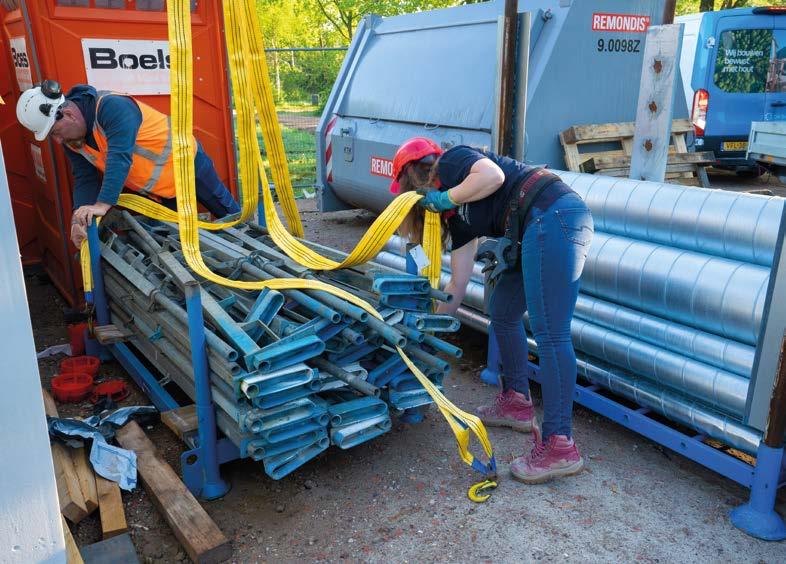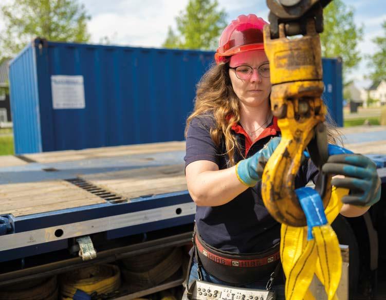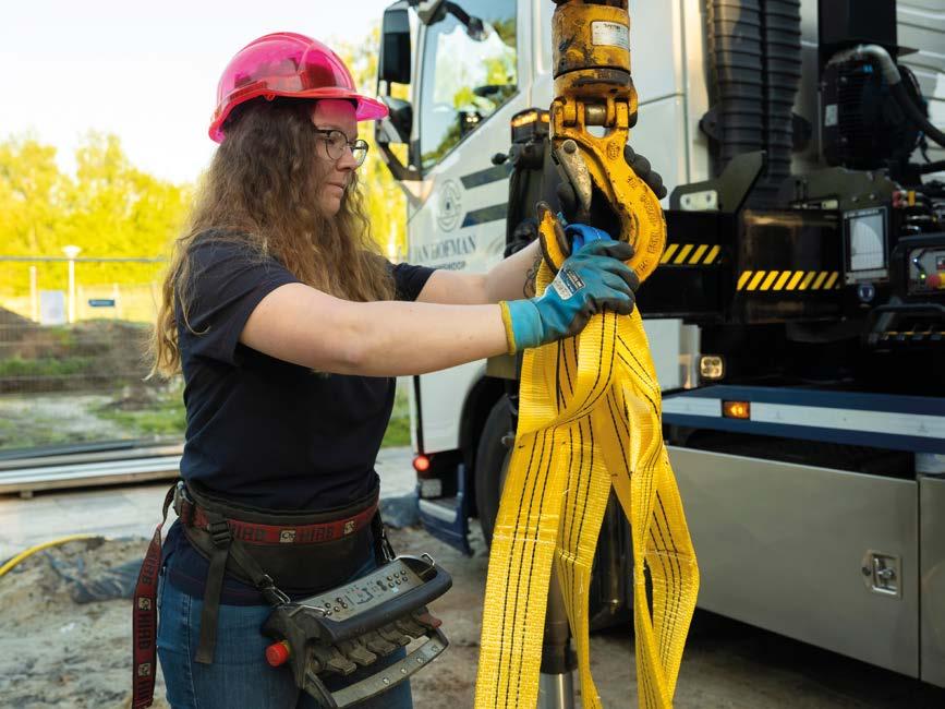 Na de koffie rijdt Nathaly met haar wagen met autolaadkraan de werkplaats op. Dan trekt ze haar knalroze werkschoenen aan en zet een roze helm op. Ze zorgt dat de vier steunpoten in de juiste positie staan zodat ze veilig de container kan plaatsen. Uitvoerder Heini plaats er stempelplaten onder. Uit een zijvak van de wagen haalt ze gele hijsbanden. “Die zijn gloednieuw. Vorige week was weer de jaarlijkse keuring van mijn kraan.”