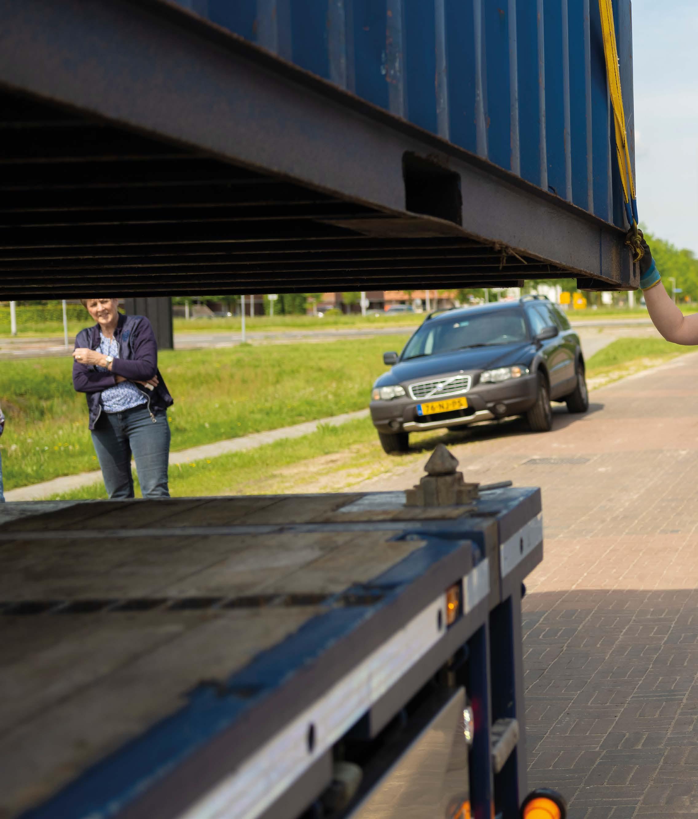 Nathaly bergt het materiaal voor het lossen op en vertrekt naar Hoogeveen om haar aanhanger op te halen. Een uur later koppelt ze de aanhanger aan op een industrieterrein aan de rand van Hoogeveen.