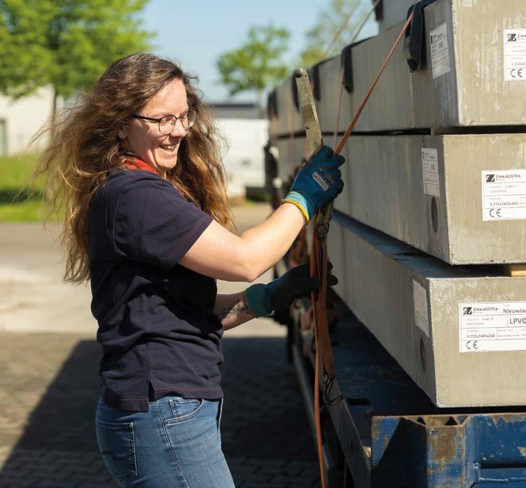 Als de zeven betonplaten op de aanhanger liggen, pakt Nathaly een dikke spanband om de lading vast te zetten. “Dadelijk rijd ik naar Vroomshoop waar ik de aanhanger met de platen afkoppel. Morgenochtend ga ik deze betonplaten en de houten opbouw lossen in een dorp hier in de buurt waar De Groot schuurtjes bouwt. Beweging krijg ik genoeg. Naar de sportschool hoef ik niet met al dat gesjouw en geklauter.”