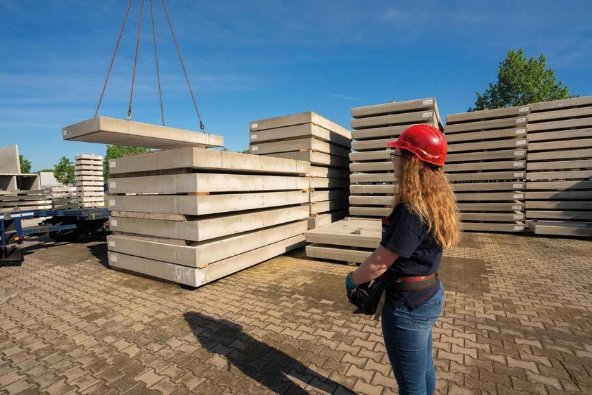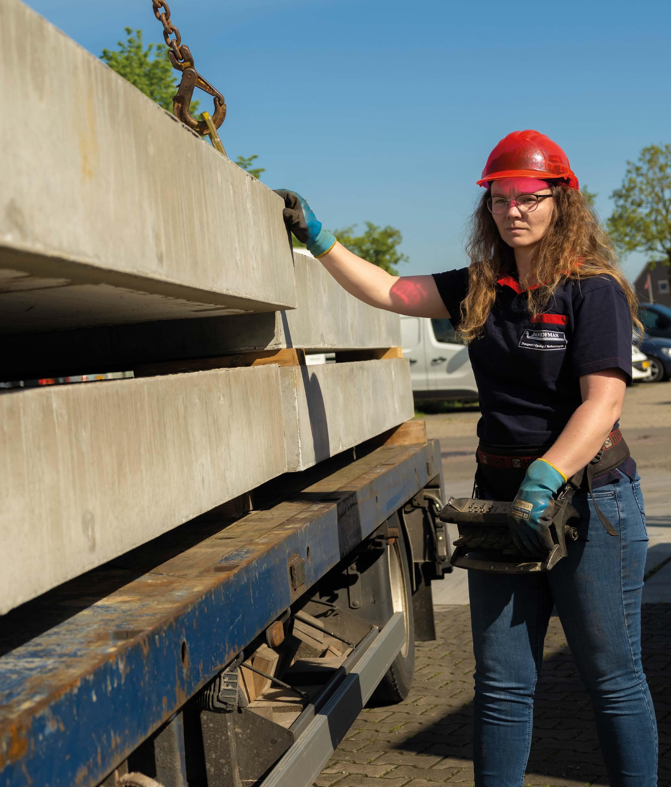 Nathaly zet haar helm op en pakt het bedieningspaneel. Daarna draait ze de steunpoten uit en plaatst er stempelplaten onder. Aan de takel van de kraan bevestigt ze twee ijzeren kettingen. “Aan die betonvloeren zitten haakjes waaraan ik de ketting kan bevestigen. De betonplaten zien er zwaarder uit dan ze zijn. Van binnen zit namelijk piepschuim. Die grote platen wegen 1.573 kilo en die kleine weegt 1.174 kilo. Door dat piepschuim kunnen we meer platen vervoeren.”