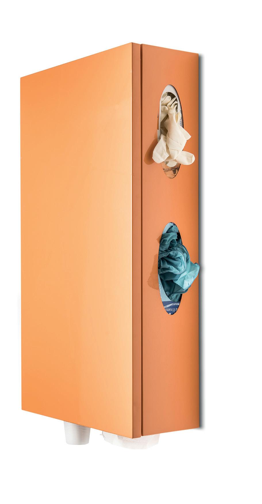Italienske Edarredo har laget et praktisk veggskap for tannlegekontoret. Plass for to hanskestørrelser/typer, to refillbokser med hansker, eske med munnbind, rad engangsbegre og papirservietter.