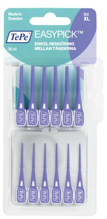 Godt, flatt grep som ikke sklir. Helt metallfri. Består av en sterk, lang kjerne av plast og et silikonbelegg med et unikt riflet mønster. Skånsom mot tannkjøttet. TePe EasyPick™ har lang arbeidsdel som er støpt i ett stykke for å gi stor kontaktflate. Fleksibel og holdbar. Forpakninger: 1, 10