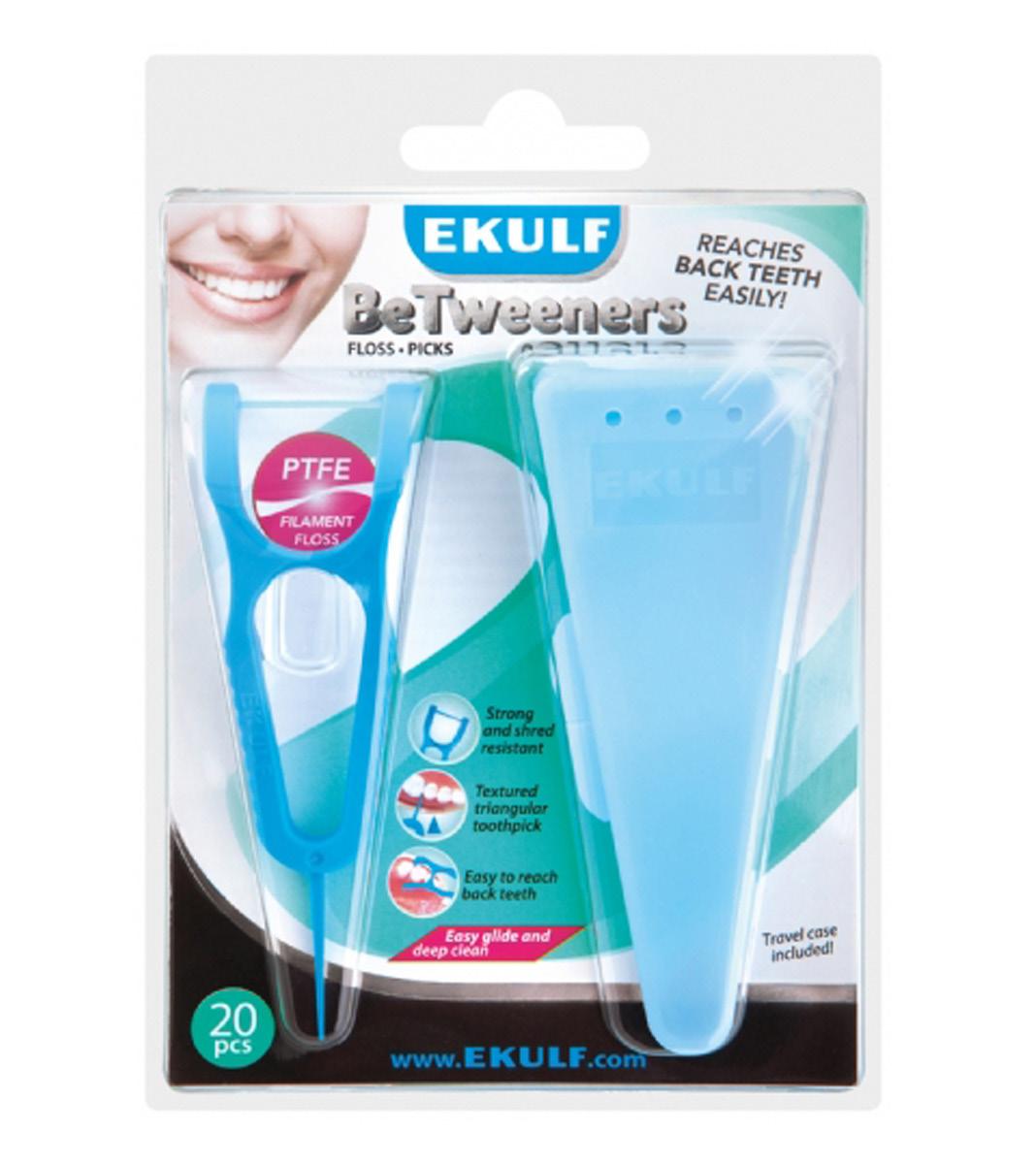 2-i-1: Ekstra tynn og ekstra bred tråd. Trekant-tannstikke i plast i andre enden med riflet overflate. 20-pk m/etui.