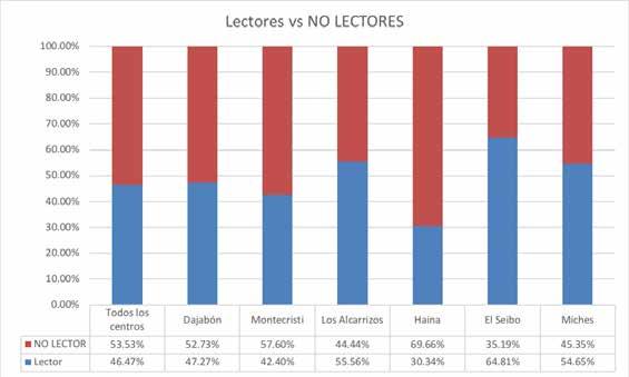 El 61 49% de los lectores pudo contestar de forma correcta 4 o 5 preguntas de comprensión El dato más positivo fue en Los Alcarrizos con el 76 92%, mientras que el más negativo fue en Montecristi con el 39 62%