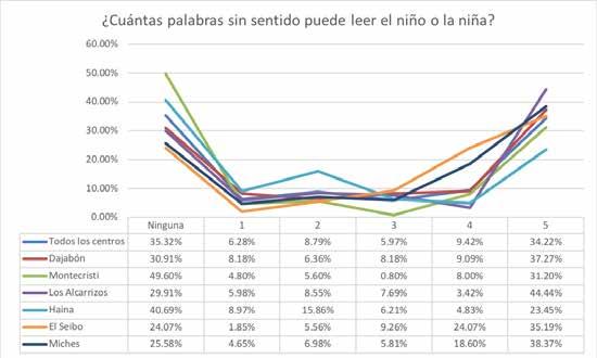 A nivel general el 48 66% puede leer un mínimo de 4 de las 5 palabras comunes propuestas Se destaca el dato de Haina donde solamente el 33 80% puede lograr este resultado
