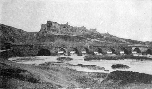 Ein vierstündiger Ritt brachte uns nach Kal'at es Seidjar. Die Burg steht auf einem langgezogenen Bergrücken, der durch einen künstlichen Einschnitt in der Mitte unterbrochen ist und steil nach dem Orontes hin abfällt. Letzterer läuft hier in einem schmalen Bett zwischen Felswänden dahin. Die Burgmauern, die die Anhöhe zwischen dem Flusse und dem Einschnitt krönen, bieten von unten gesehen einen prächtigen Anblick. Am Fuße des Hügels liegt ein kleines Dorf aus Bienenkorbhütten. Der Unmenge behauener Steine nach zu urteilen, die auf dem grasigen Nordabhang verstreut liegen, muß sich früher hier die seleucidische Stadt Larissa befunden haben. Ich errichtete meine Zelte am äußersten Ende der Brücke in einem Aprikosenhain, der in weißem Blütenschnee stand und von dem Summen der Bienen erfüllt war. Anemonen und scharlachrote Ranunkeln bedeckten den Grasboden. Das Kastell ist Eigentum des Scheich Ahmed Seidjari, in dessen Familie es sich bereits seit drei Jahrhunderten befindet. Er und seine Söhne bewohnen einige kleine, moderne, aus alten Steinen erbaute Häuser inmitten der Festungswerke. Ihm gehört auch ein ziemlich großer Grundbesitz sowie ungefähr ein Drittel des Dorfes, in das Übrige teilen sich die Killānis von Hamāh und die Smātijjeh-Araber zu ungleichen Teilen.