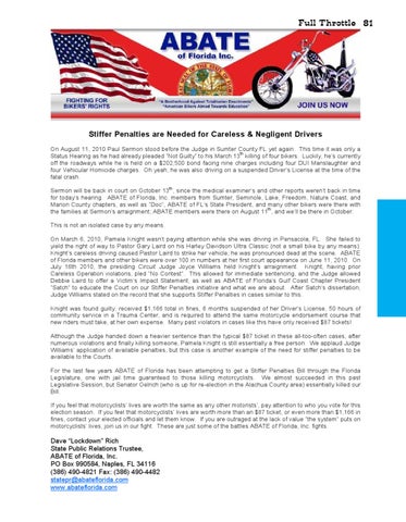 Stiffer Penalties are Needed for Careless & Negligent Drivers On August 11, 2010 Paul Sermon stood before the Judge in Sumter County FL yet again. This time it was only a th Status Hearing as he had already pleaded “Not Guilty” to his March 13 killing of four bikers. Luckily, he’s currently off the roadways while he is held on a $202,500 bond facing nine charges including four DUI Manslaughter and four Vehicular Homicide charges. Oh yeah, he was also driving on a suspended Driver’s License at the time of the fatal crash. Sermon will be back in court on October 13th, since the medical examiner’s and other reports weren’t back in time for today’s hearing. ABATE of Florida, Inc. members from Sumter, Seminole, Lake, Freedom, Nature Coast, and Marion County chapters, as well as “Doc”, ABATE of FL’s State President, and many other bikers were there with th the families at Sermon’s arraignment; ABATE members were there on August 11 , and we’ll be there in October. This is not an isolated case by any means. On March 6, 2010, Pamela Knight wasn’t paying attention while she was driving in Pensacola, FL. She failed to yield the right of way to Pastor Gary Laird on his Harley Davidson Ultra Classic (not a small bike by any means). Knight’s careless driving caused Pastor Laird to strike her vehicle; he was pronounced dead at the scene. ABATE of Florida members and other bikers were over 100 in numbers at her first court appearance on June 11, 2010. On July 16th 2010, the presiding Circuit Judge Joyce Williams held Knight’s arraignment. Knight, having prior Careless Operation violations, pled “No Contest”. This allowed for immediate sentencing, and the Judge allowed Debbie Laird to offer a Victim’s Impact Statement, as well as ABATE of Florida’s Gulf Coast Chapter President “Satch” to educate the Court on our Stiffer Penalties initiative and what we are about. After Satch’s dissertation, Judge Williams stated on the record that she supports Stiffer Penalties in cases similar to this. Knight was found guilty, received $1,166 total in fines, 6 months suspended of her Driver’s License, 50 hours of community service in a Trauma Center, and is required to attend the same motorcycle endorsement course that new riders must take, at her own expense. Many past violators in cases like this have only received $87 tickets! Although the Judge handed down a heavier sentence than the typical $87 ticket in these all-too-often cases, after numerous violations and finally killing someone, Pamela Knight is still essentially a free person. We applaud Judge Williams’ application of available penalties, but this case is another example of the need for stiffer penalties to be available to the Courts. For the last few years ABATE of Florida has been attempting to get a Stiffer Penalties Bill through the Florida Legislature, one with jail time guaranteed to those killing motorcyclists. We almost succeeded in this past Legislative Session, but Senator Oelrich (who is up for re-election in the Alachua County area) essentially killed our Bill. If you feel that motorcyclists’ lives are worth the same as any other motorists’, pay attention to who you vote for this election season. If you feel that motorcyclists’ lives are worth more than an $87 ticket, or even more than $1,166 in fines, contact your elected officials and let them know. If you are outraged at the lack of value “the system” puts on motorcyclists’ lives, join us in our fight. These are just some of the battles ABATE of Florida, Inc. fights.