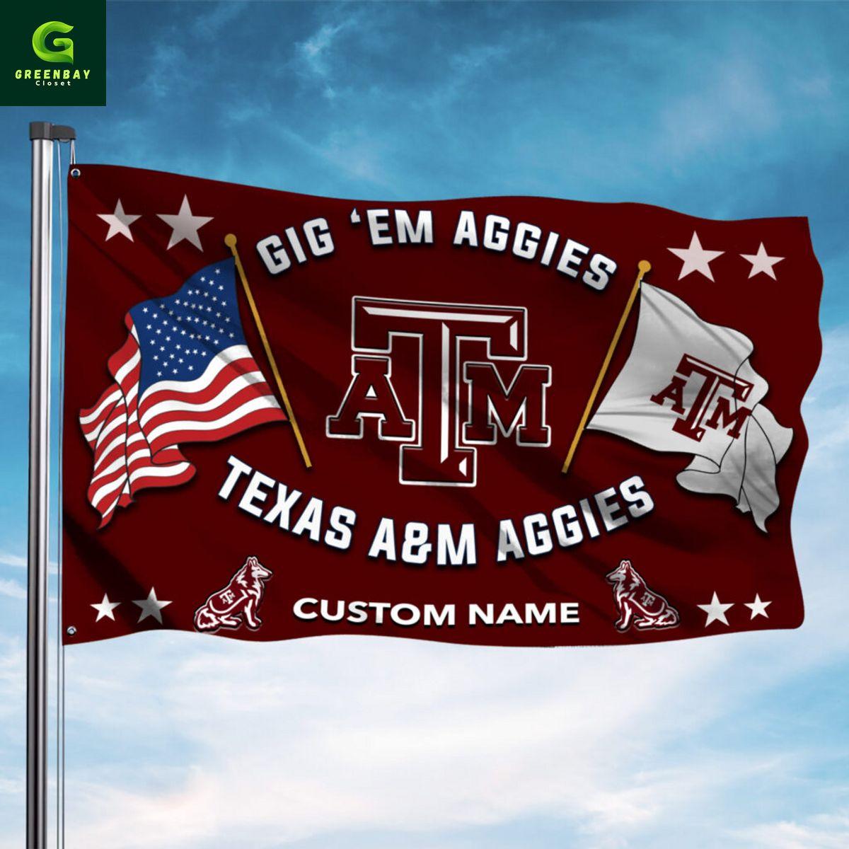 Buy it here: https://greenbayclother.com/product/texas-am-aggies-gig-em-aggiescustome-name-flag/From: Toneytees