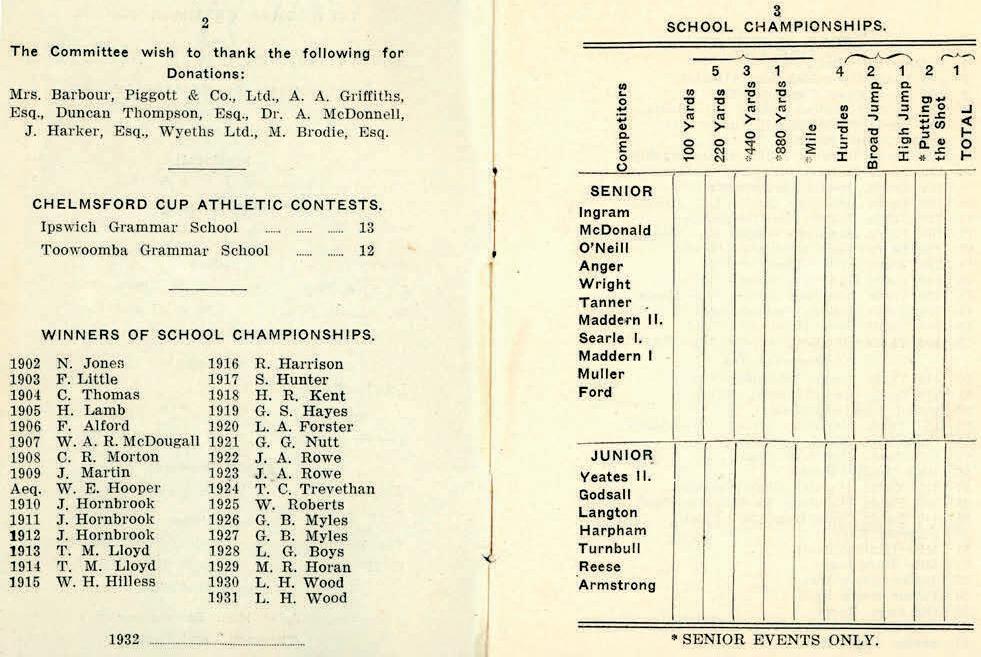 I wish to acknowledge the research and efforts of Dr Goodman in writing Toowoomba Grammar School, 1875-1975: A Centenary History. Dr Goodman’s authorship resulted from the foresight of the School’s then Chairman of the Board of Trustees, Dr Ian Gibson, fellow Trustees at that time, and the then Headmaster of the School, Mr W.M. Dent.