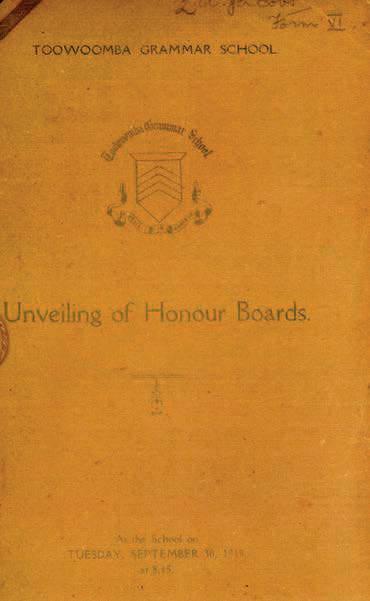 Please remember, too, those who have done their duty nobly and well in less conspicuous, and perhaps in less competent, but not in less worthy ways. At the same time, I ask you not to forget those, who, often through no faults of their own, have baulked at life's hurdles - those Old Boys who may be sick and ailing, on the brink of Eternity. I ask you to bring to mind the lengthening of illustrious Headmasters and other Masters, who have contributed so much to the development of the School, which, I feel, is most unique in character, and which continues to train not only good, true and brave Australians - men worthy in every way of their pioneering forbears, but also young people from other lands, who are attending the School because those responsible for their education believe that those boys will assimilate knowledge and scholarship that is worthwhile, receiving at the same time a training of character that is worth even more. ......”. (Source –Toowoomba Grammar School Annual Magazine 1963, pg.49).