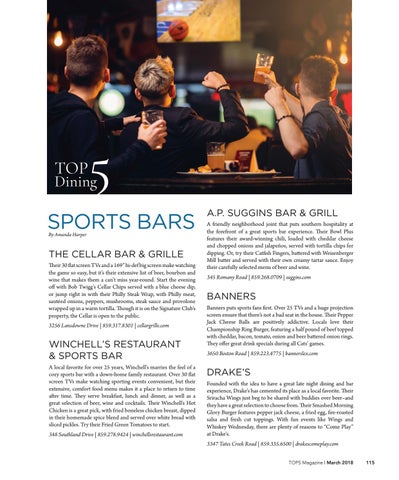 DRAKE’S Founded with the idea to have a great late night dining and bar experience, Drake’s has cemented its place as a local favorite. Their Sriracha Wings just beg to be shared with buddies over beer–and they have a great selection to choose from. Their Smashed Morning Glory Burger features pepper jack cheese, a fried egg, fire-roasted salsa and fresh cut toppings. With fun events like Wings and Whiskey Wednesday, there are plenty of reasons to “Come Play” at Drake’s. 3347 Tates Creek Road | 859.335.6500 | drakescomeplay.com TOPS Magazine | March 2018