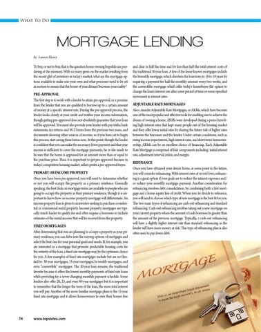 and clear in half the time and for less than half the total interest costs of the traditional 30-year loan. A few of the lesser known mortgages include the biweekly mortgage, which shortens the loan term to 18 to 19 years by requiring a payment for half the monthly amount every two weeks, and the convertible mortgage which offer today’s homebuyer the option to change the loan’s interest rate after some period of time or some specified movement in interest rates. ADJUSTABLE RATE MORTGAGES Also consider Adjustable Rate Mortgages, or ARMs, which have become one of the most popular and effective tools for enabling one to achieve the dream of owning a home. ARMs were developed during a period involving high interest rates that kept many people out of the housing market and they offer lower initial rates by sharing the future risk of higher rates between the borrower and the lender. Under certain conditions, such as rising income expectations, high interest rates, and short-term homeownership, ARMs can be an excellent choice of financing. Each Adjustable Rate Mortgage is comprised of four components including: initial interest rate, adjustment interval, index, and margin. REFINANCE Once you have obtained your dream home, at some point in the future, you will consider refinancing. With interest rates at record lows, refinancing is a great option if your goals are to reduce the interest expenses and/ or reduce your monthly mortgage payment. Another consideration for refinancing involves debt consolidation, by combining both a first mortgage and a home equity line of credit. When you do decide to refinance, you will need to choose which type of new mortgage is the best fit for you. The two main types of refinancing are cash-out refinancing and standard refinancing. Cash-out refinancing involves taking out a new mortgage on your current property where the amount of cash borrowed is greater than the amount of the previous mortgage. Typically, a cash-out refinancing will have a slightly higher interest rate than standard refinancing as the lender will have more money at risk. This type of refinancing plan is also often used to pay down debt.