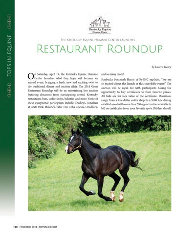n Saturday, April 19, the Kentucky Equine Humane Center launches what they hope will become an annual event, bringing a fresh, new and exciting twist to the traditional dinner and auction affair. The 2014 Great Restaurant Roundup will be an entertaining live auction featuring donations from participating central Kentucky restaurants, bars, coffee shops, bakeries and more. Some of these exceptional participants include: Dudley’s, Jonathan at Gratz Park, Malone’s, Table 310, Coba Cocina, Cheddar’s,